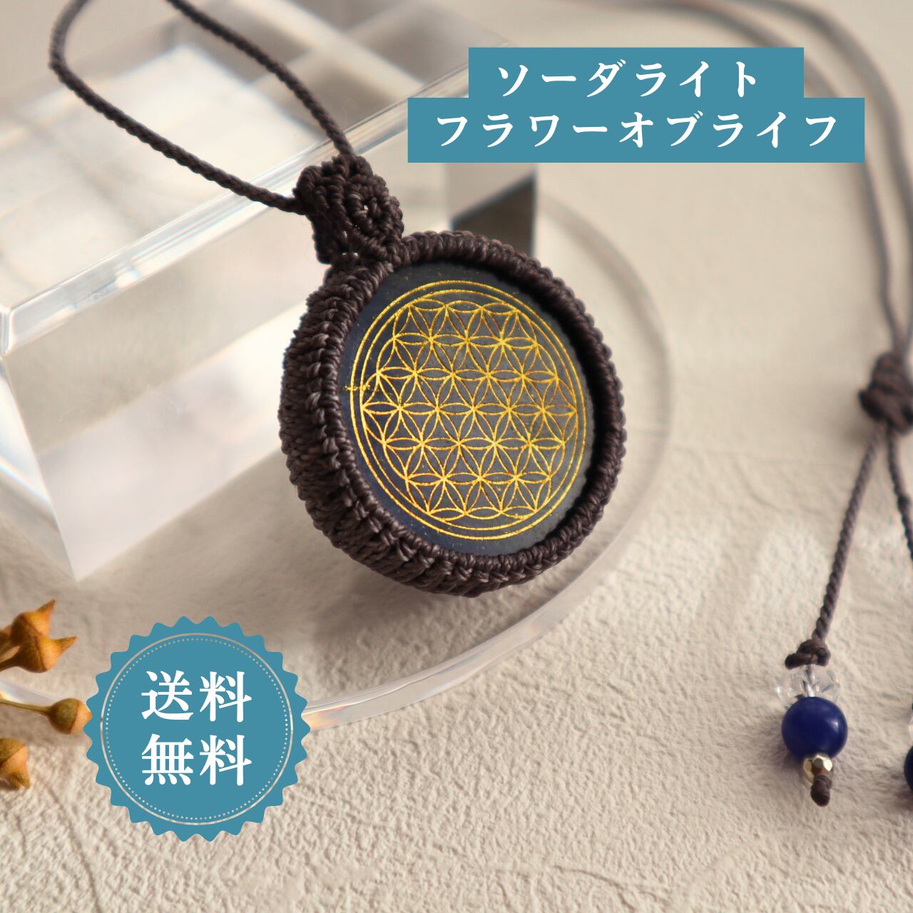 ペンダントトップ ネックレス ソーダライト フラワーオブライフ グレー紐 金属アレルギー対応 マクラメ 神聖幾何学 510307大人かわいい ネックレス