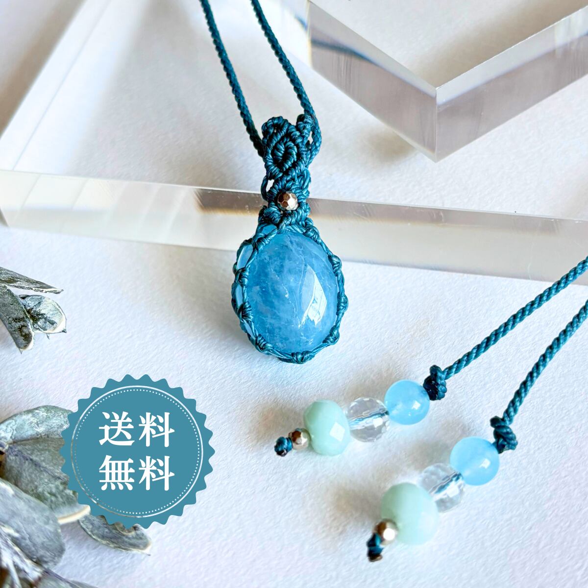 ペンダントトップ ネックレス ペンダント アクアマリン 金属アレルギー対応 マクラメ編み 大人かわいい シンプル ブルー紐 天然石 青石 510702