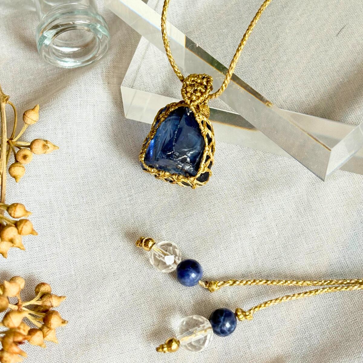 ペンダントトップ ネックレス 天然石 アンダラクリスタル シエラネバダ産 金属アレルギー対応 マクラメ編み エレスチャルサファイア 大人可愛い プレゼント 青石 ゴールド紐 5010005