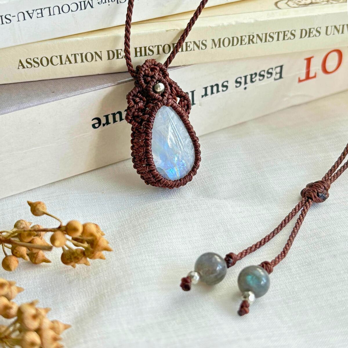 ペンダントトップ ネックレス ペンダント 天然石 ホワイトラブラドライト 金属アレルギー対応 マクラメ編み 大人可愛い プレゼント 白石 茶紐 511104
