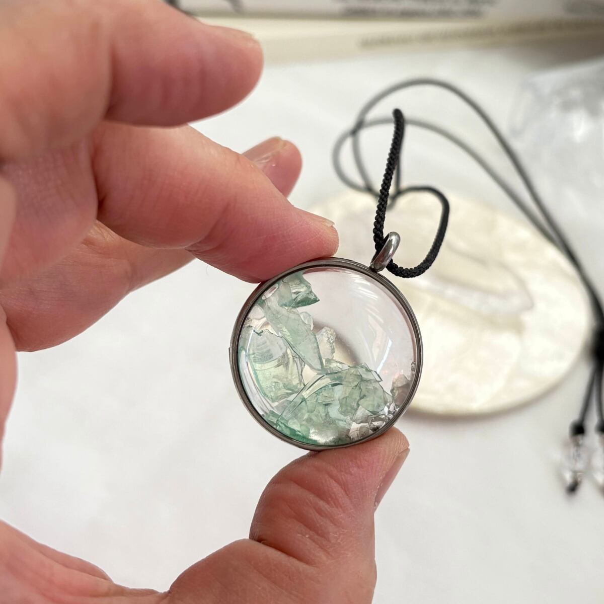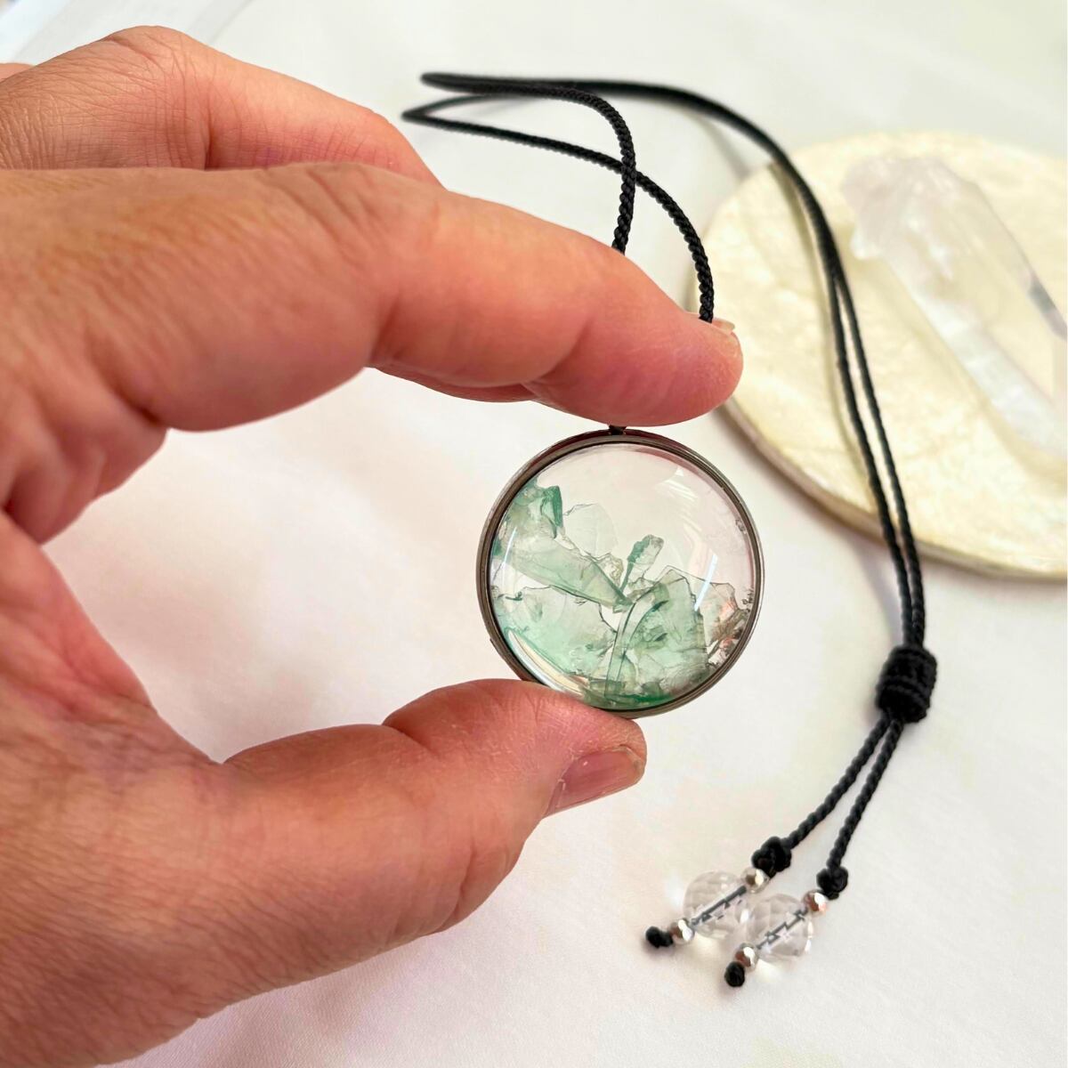こちらは、透明感のあるアンダラクリスタルのさざれ石をガラストップに閉じ込めました。