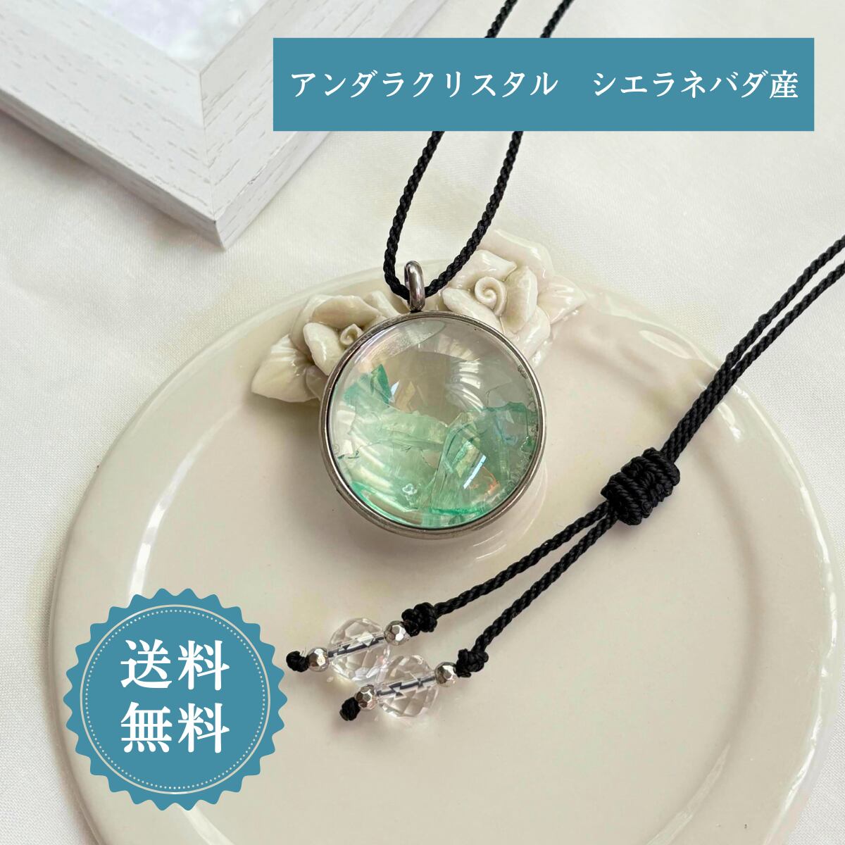 ペンダントトップ ネックレス 天然石 大きめ アンダラクリスタル エメラルドシフト 金属アレルギー対応 マクラメ 大人かわいい 黒紐 501201