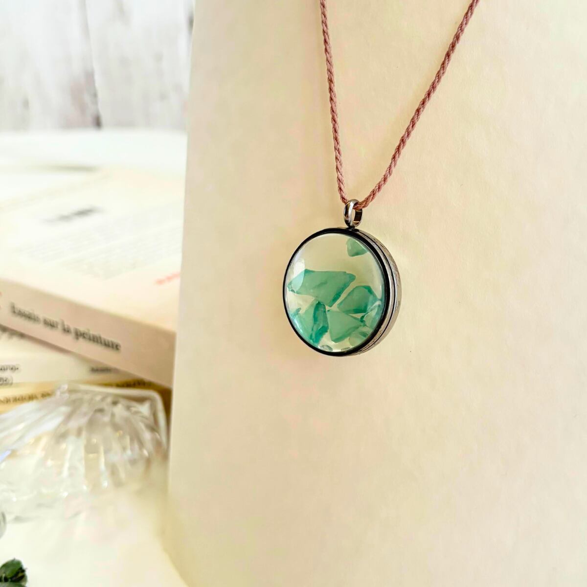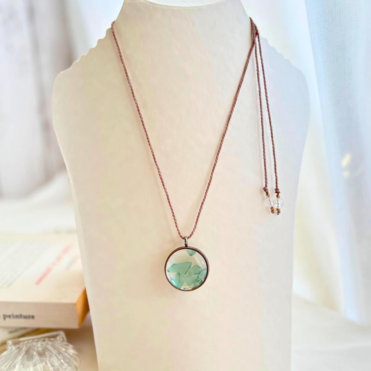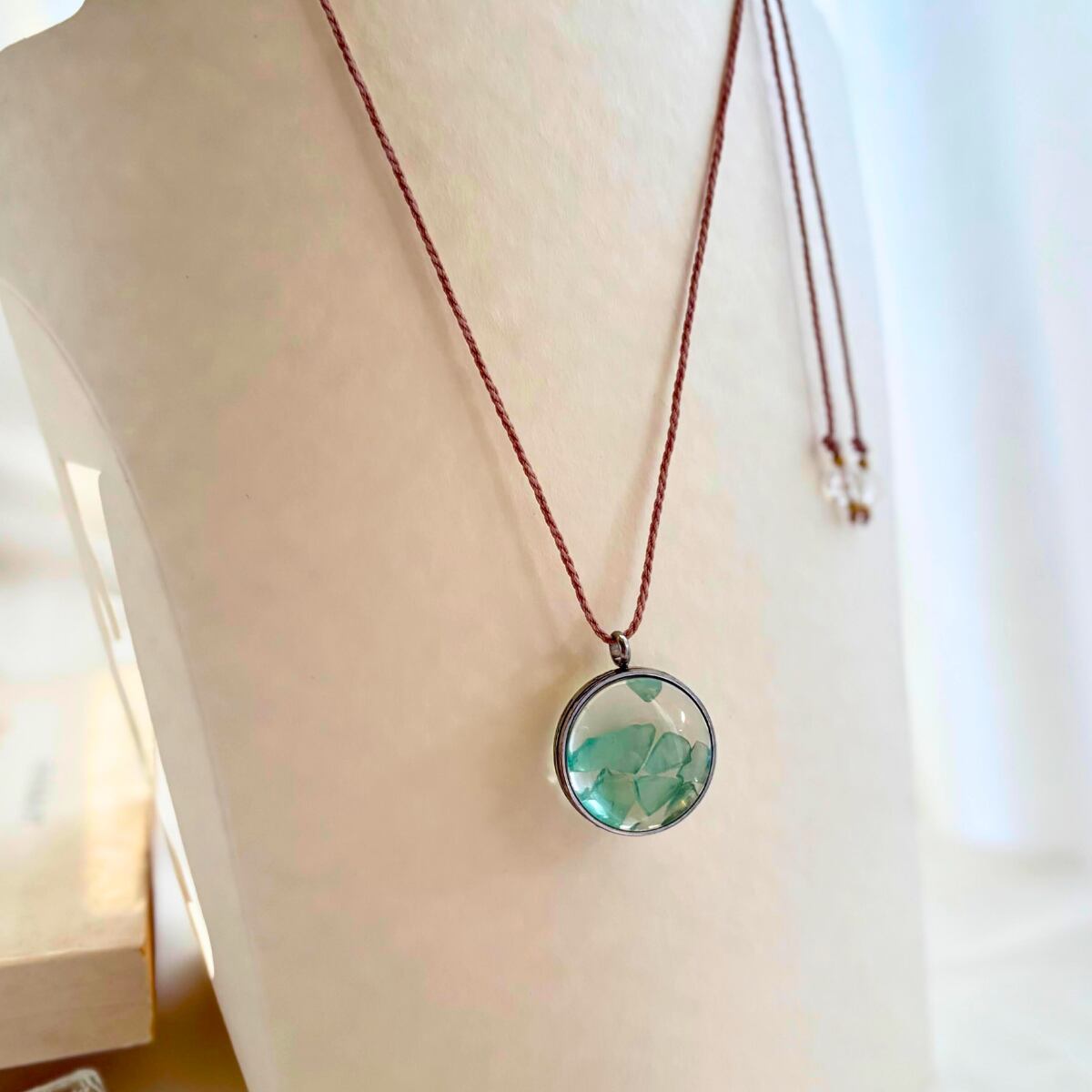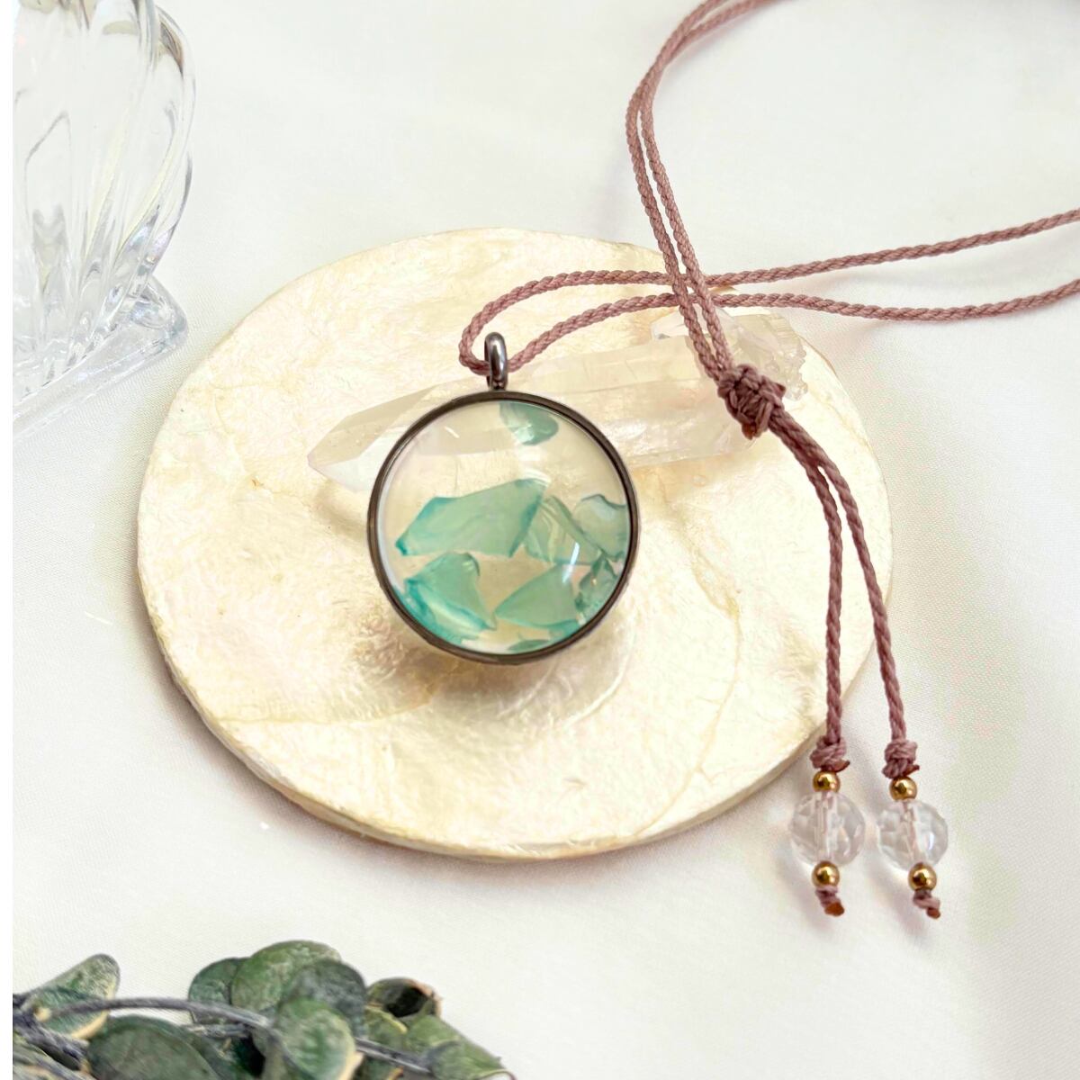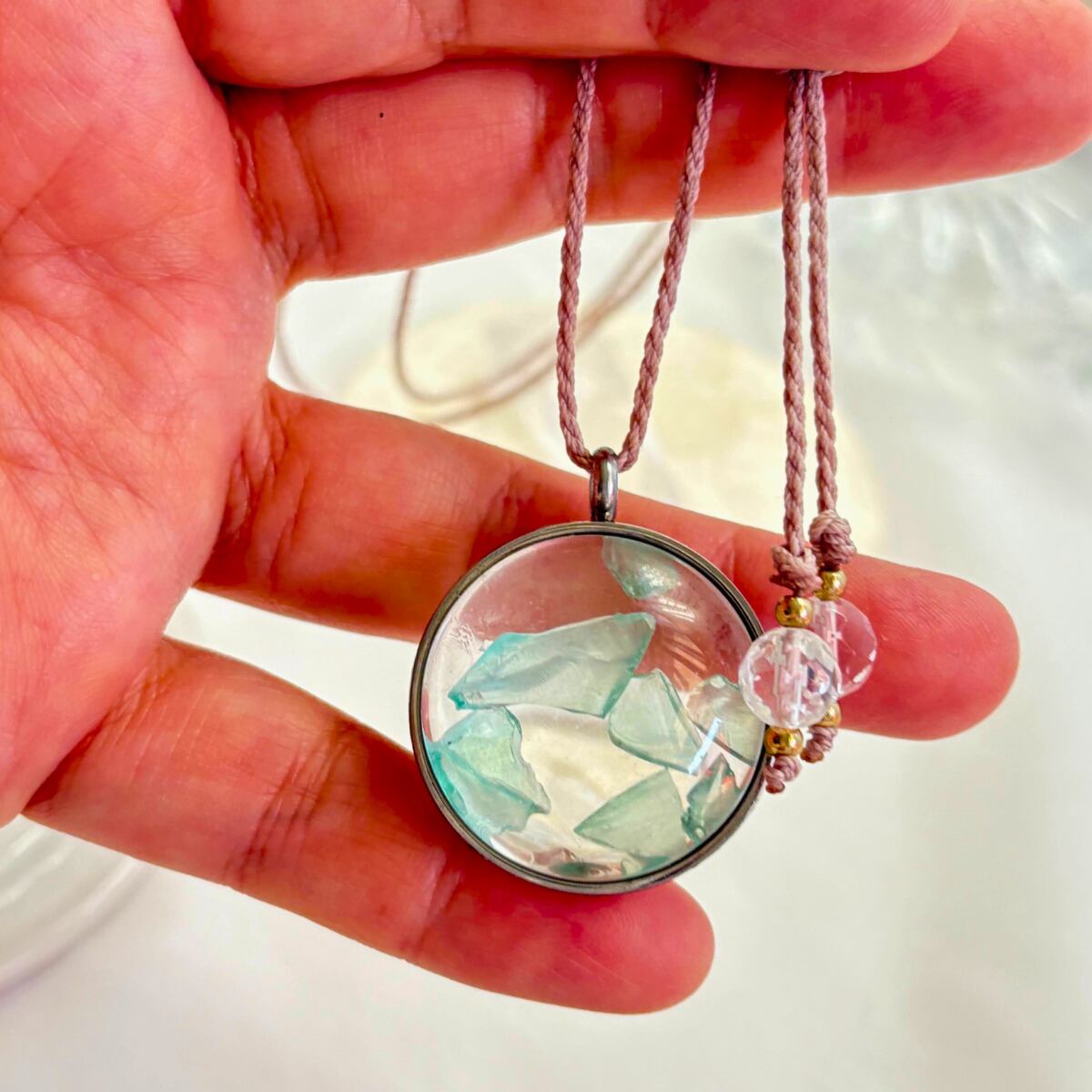 こちらは、シエラネバダ産の透明感あふれるアンダラクリスタルのさざれ石を、ガラスドームに閉じ込めた魅力的なペンダントです。