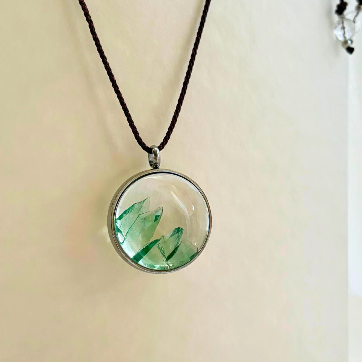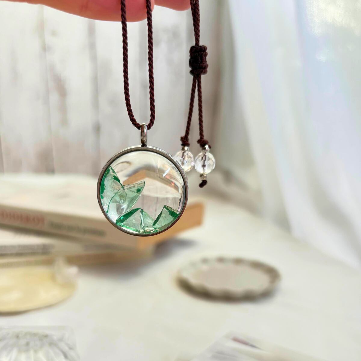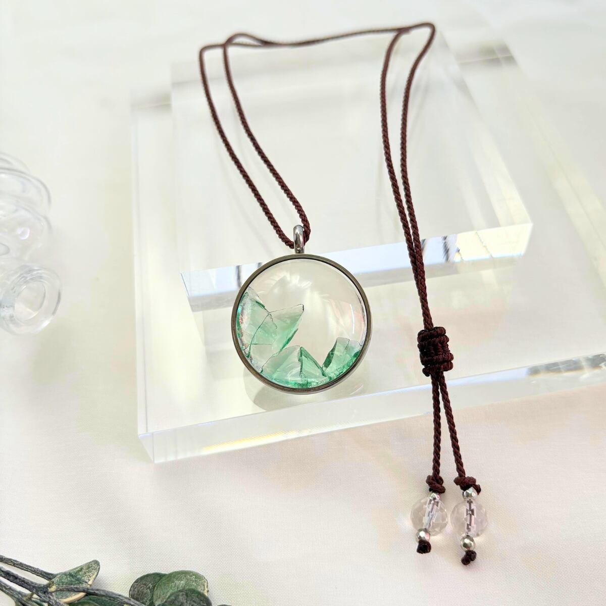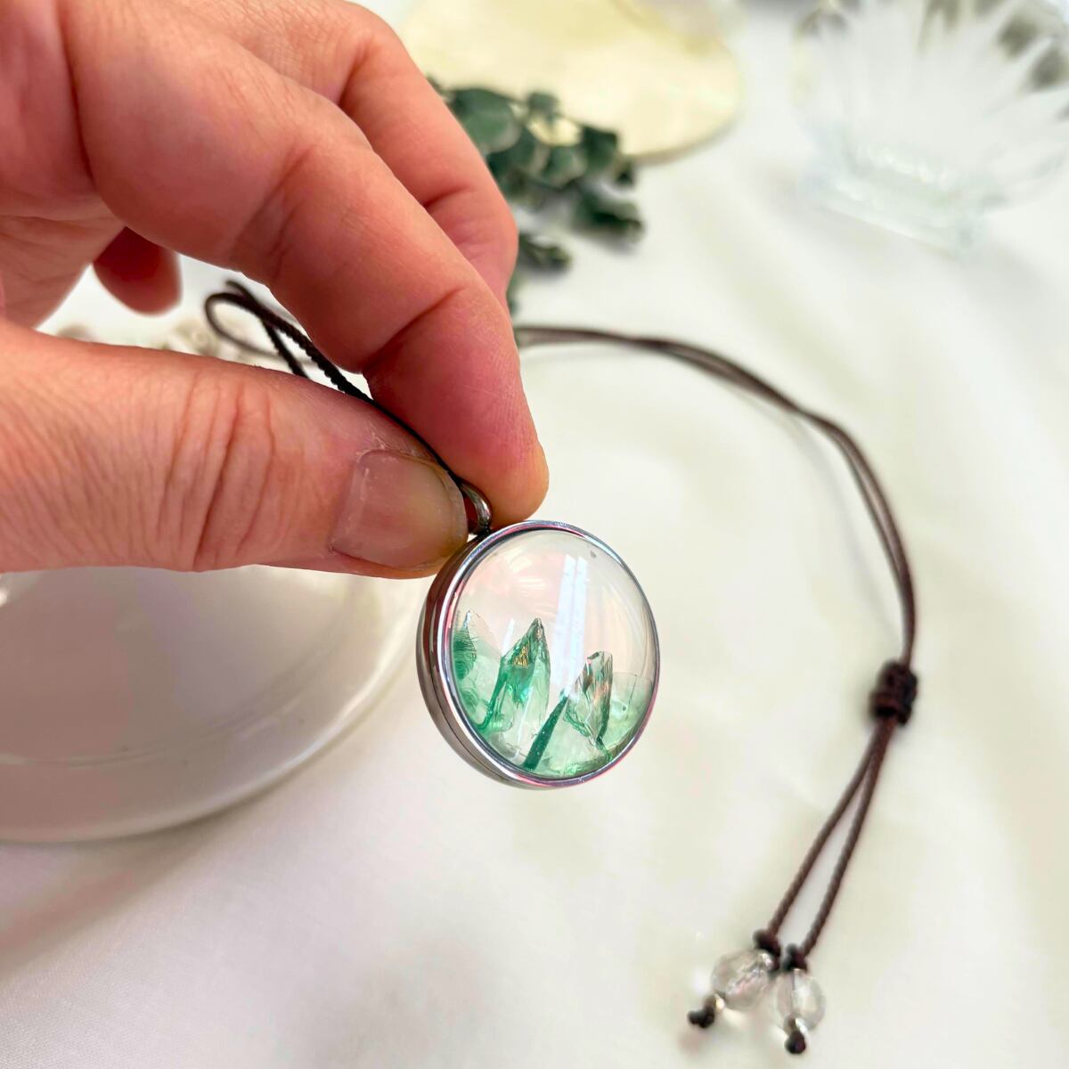 こちらは、シエラネバダ産の透明感あふれるアンダラクリスタルのさざれ石を、ガラスドームに閉じ込めた魅力的なペンダントです。
