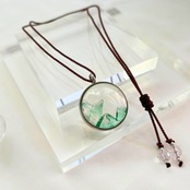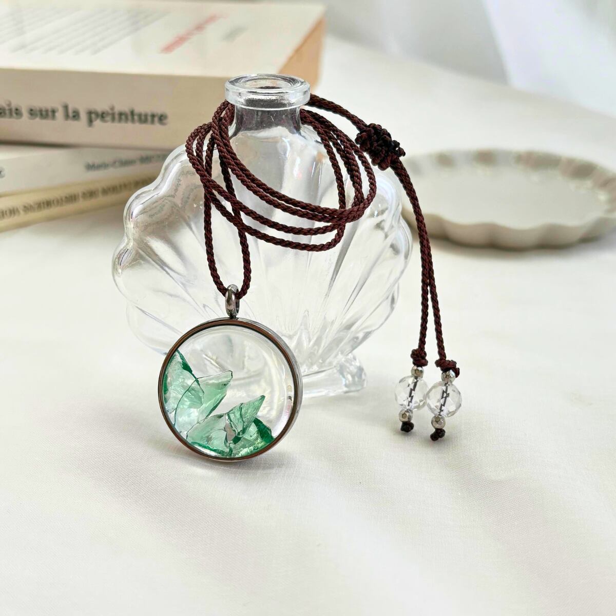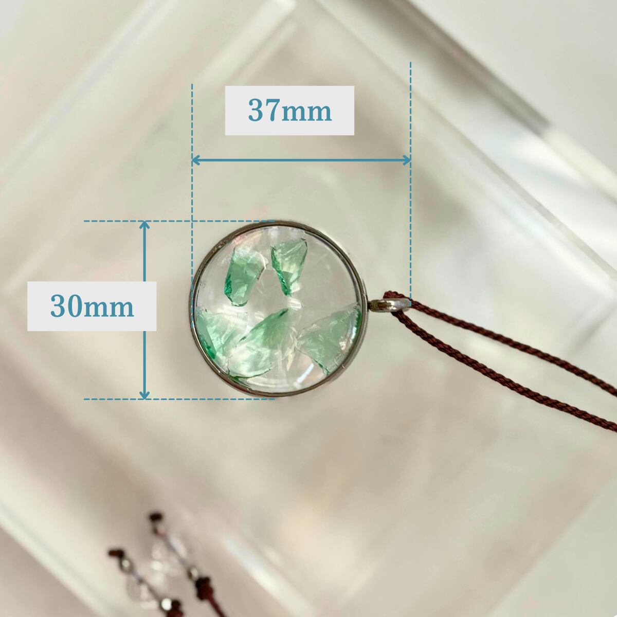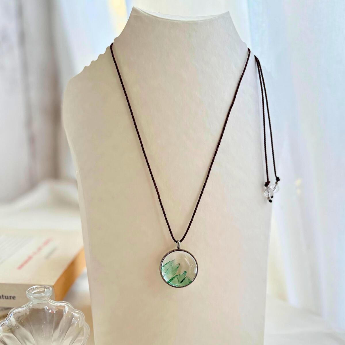 こちらは、シエラネバダ産の透明感あふれるアンダラクリスタルのさざれ石を、ガラスドームに閉じ込めた魅力的なペンダントです。