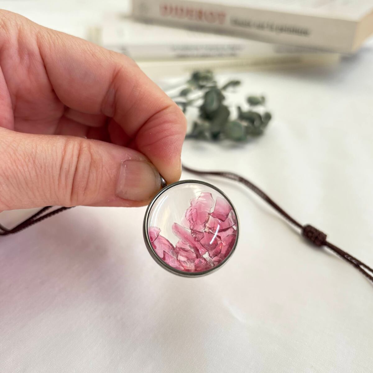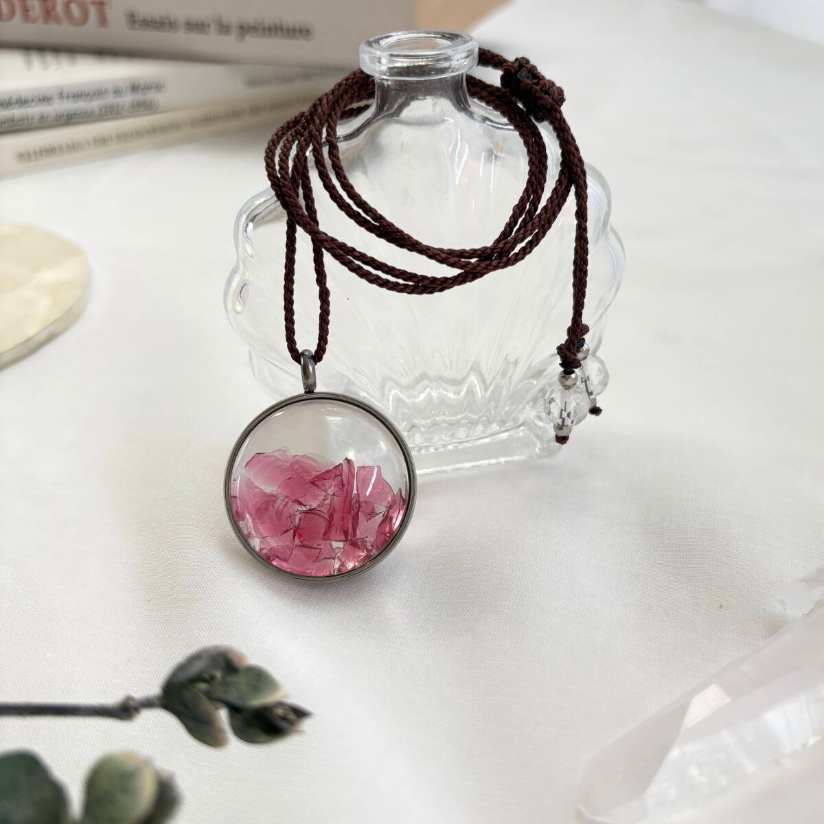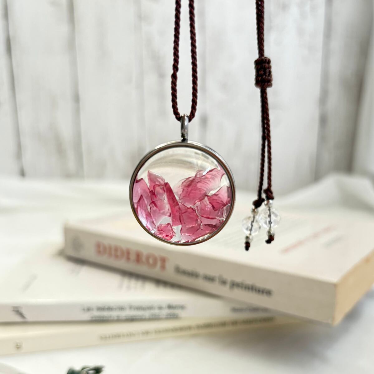こちらは、シエラネバダ産の鮮やかなラズベリー色のアンダラクリスタルを、洗練されたマクラメ編みのロウビキ紐で仕上げた魅力的なペンダントです。
