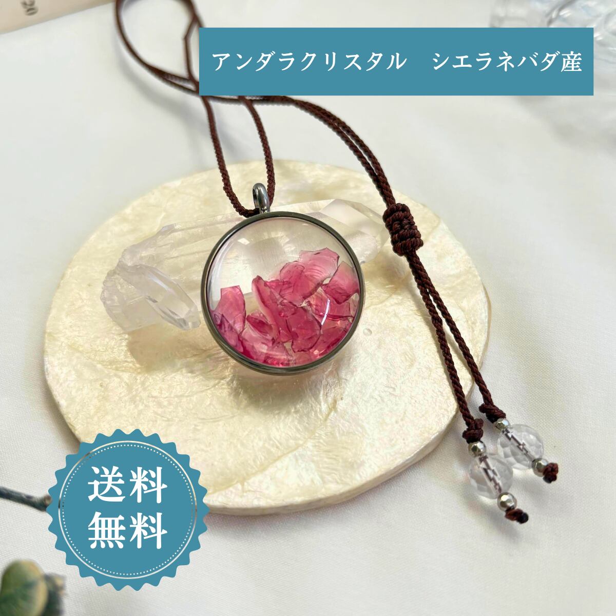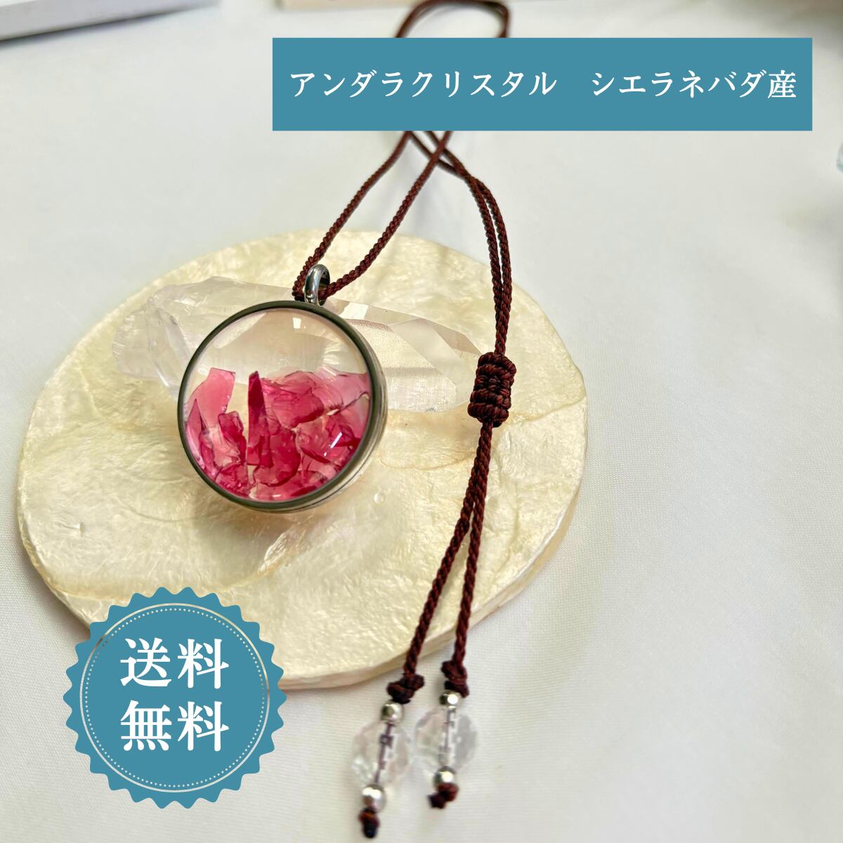 ペンダントトップ ネックレス 天然石 大きめ 金属アレルギー対応 マクラメ編み ロウビキ紐 大人かわいい アンダラクリスタル ラズベリー シエラネバダ産 さざれ石 茶紐 501205レムリア