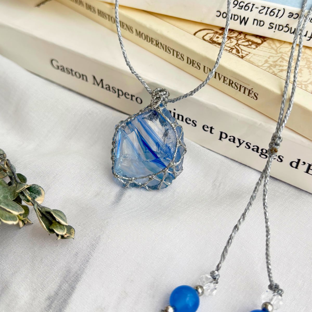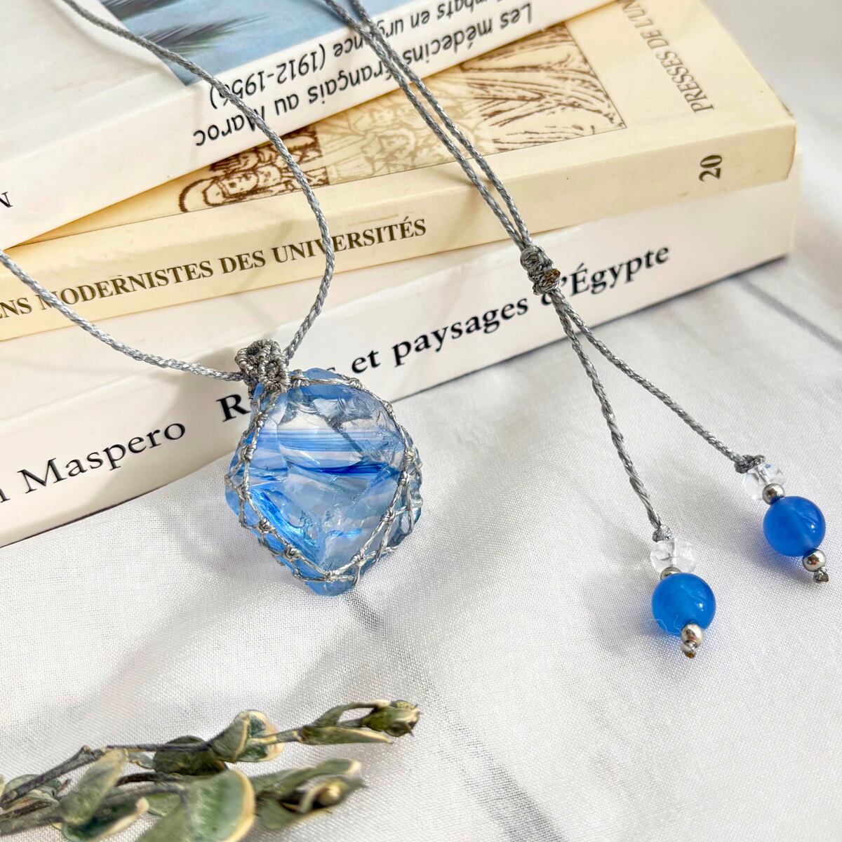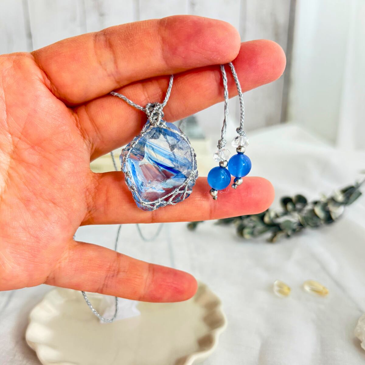 ペンダントトップ ネックレス 天然石 アンダラクリスタル シエラネバダ産 金属アレルギー対応 マクラメ編み コズミックアイス バンデッド 大人可愛い 薄水色石 しま模様 シルバー紐 600205