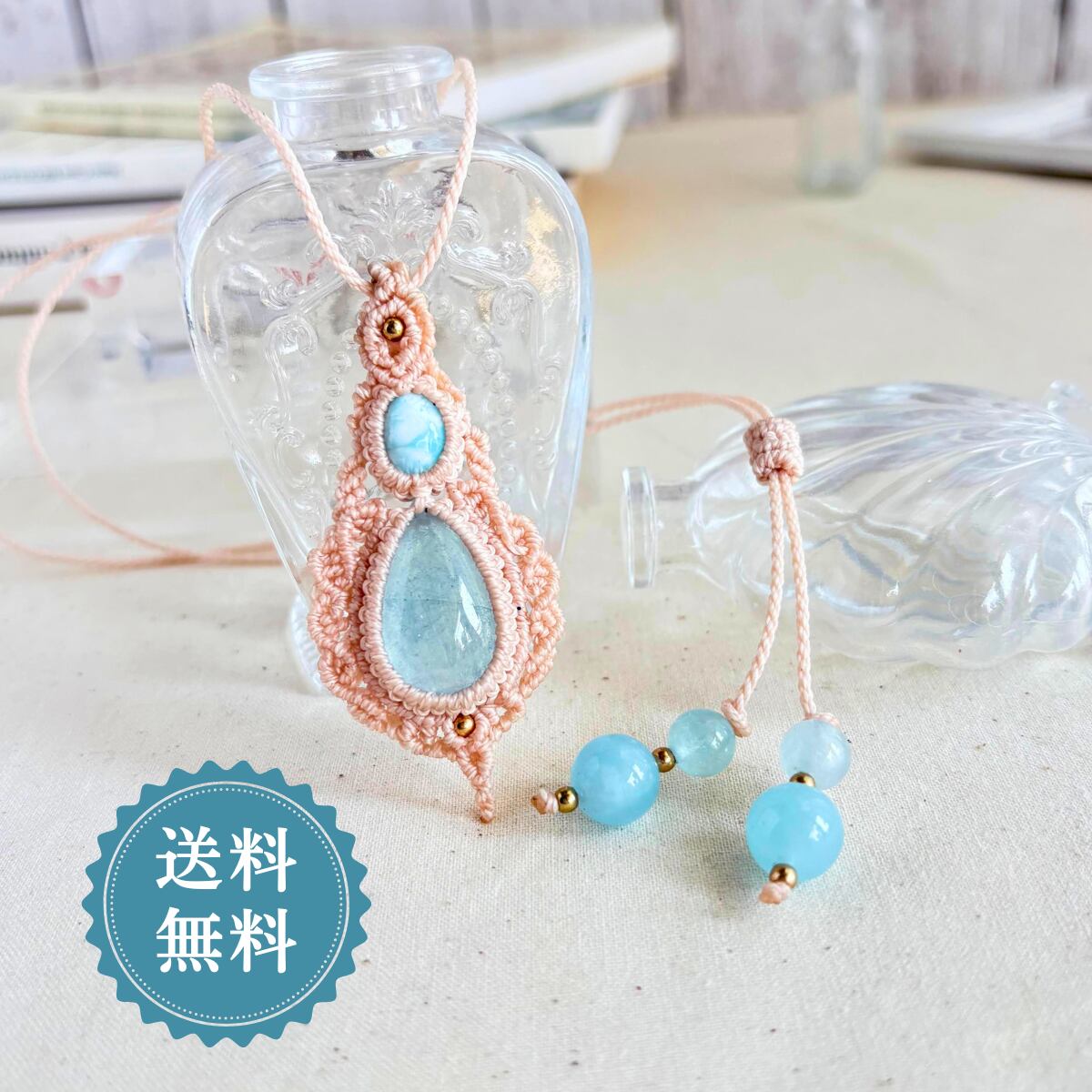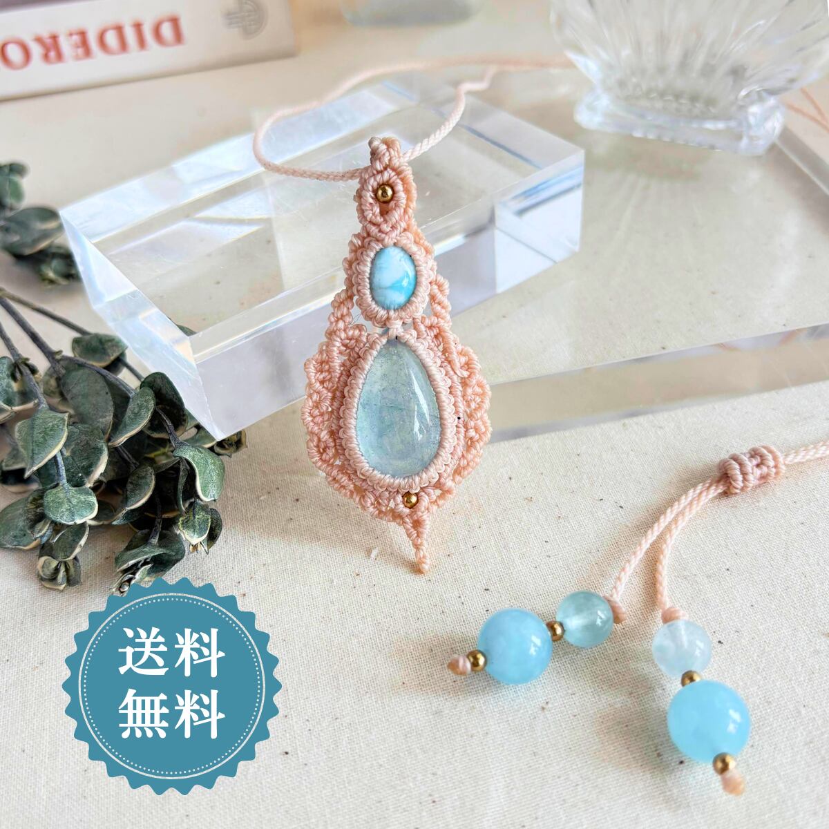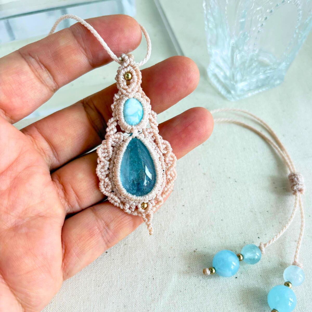 ペンダントトップ ネックレス ペンダント天然石 ラリマー アクアマリン 金属アレルギー対応 マクラメ編み 大人かわいい 高波動 水色石 オフホワイト紐 610402