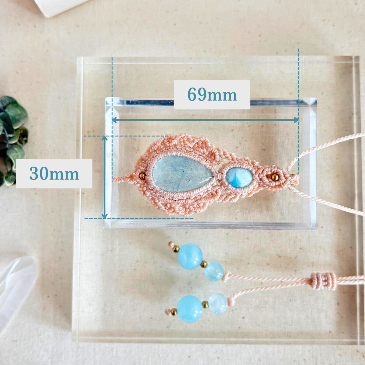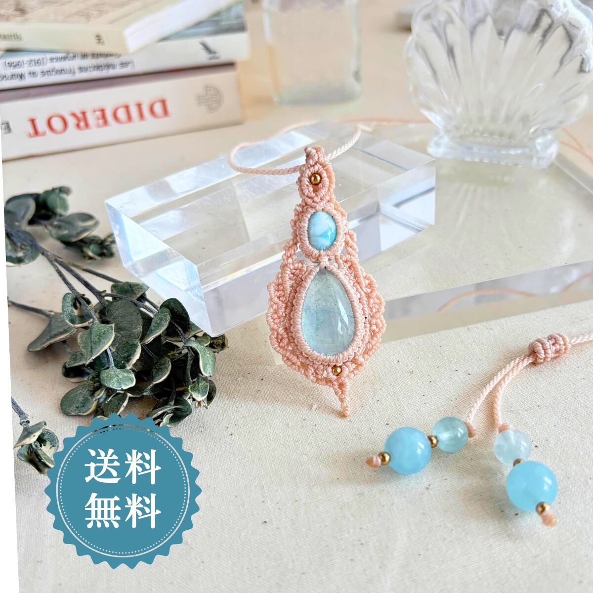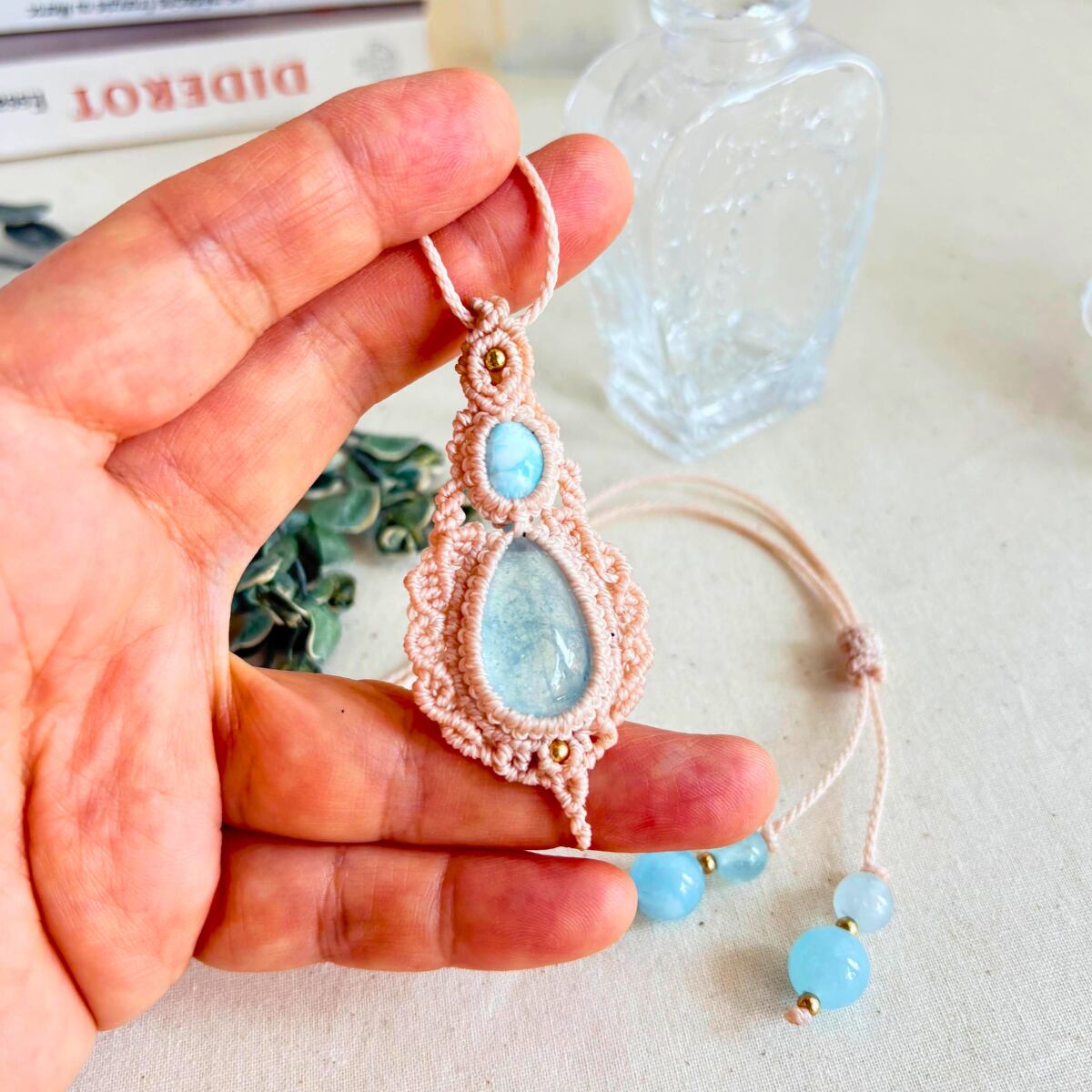 ペンダントトップ ネックレス ペンダント天然石 ラリマー アクアマリン 金属アレルギー対応 マクラメ編み 大人かわいい 高波動 水色石 オフホワイト紐 610402