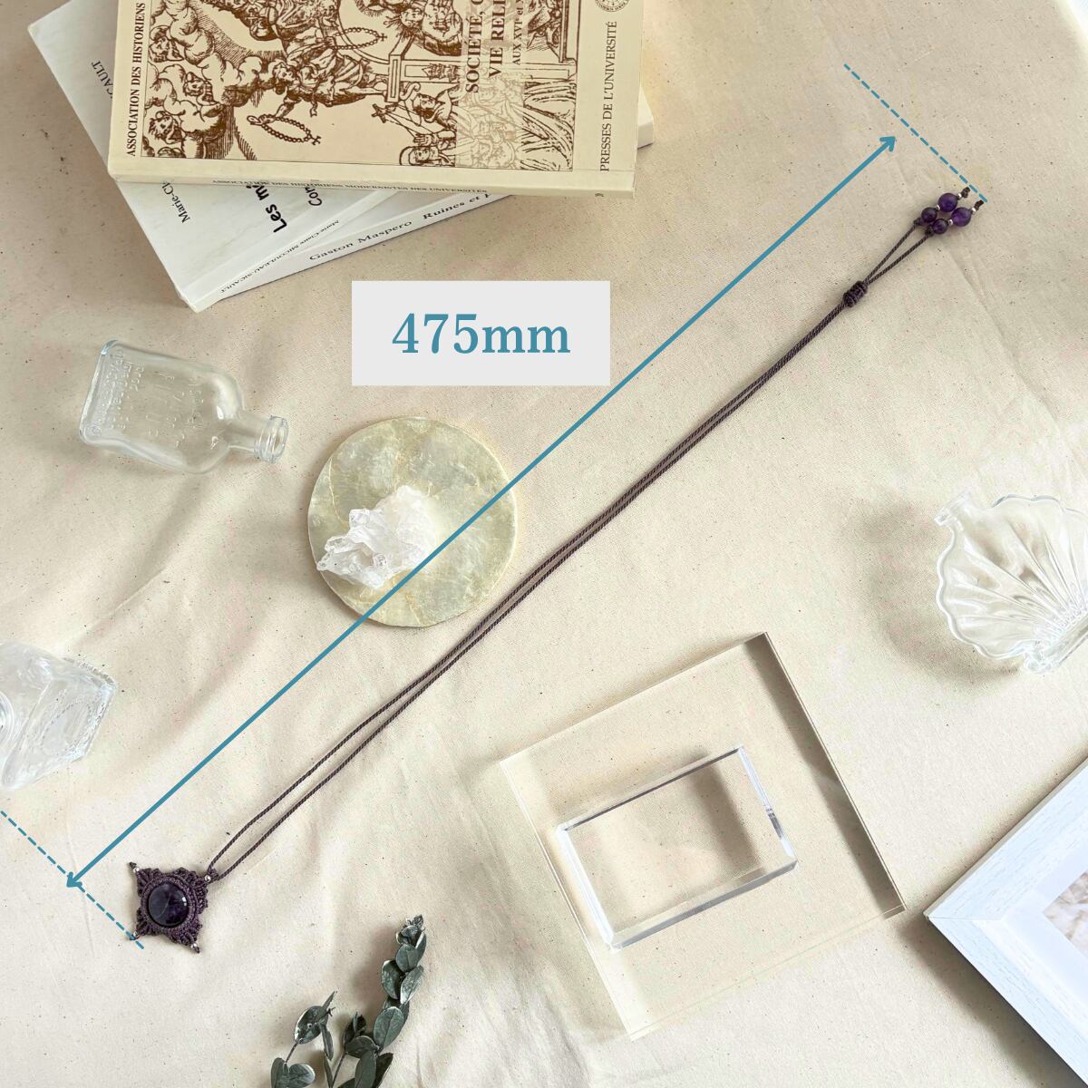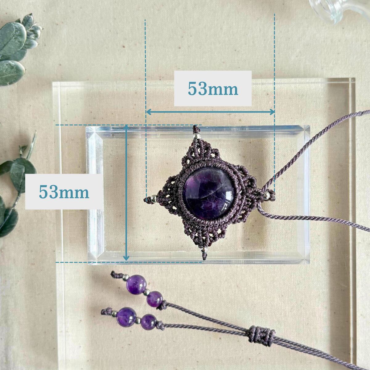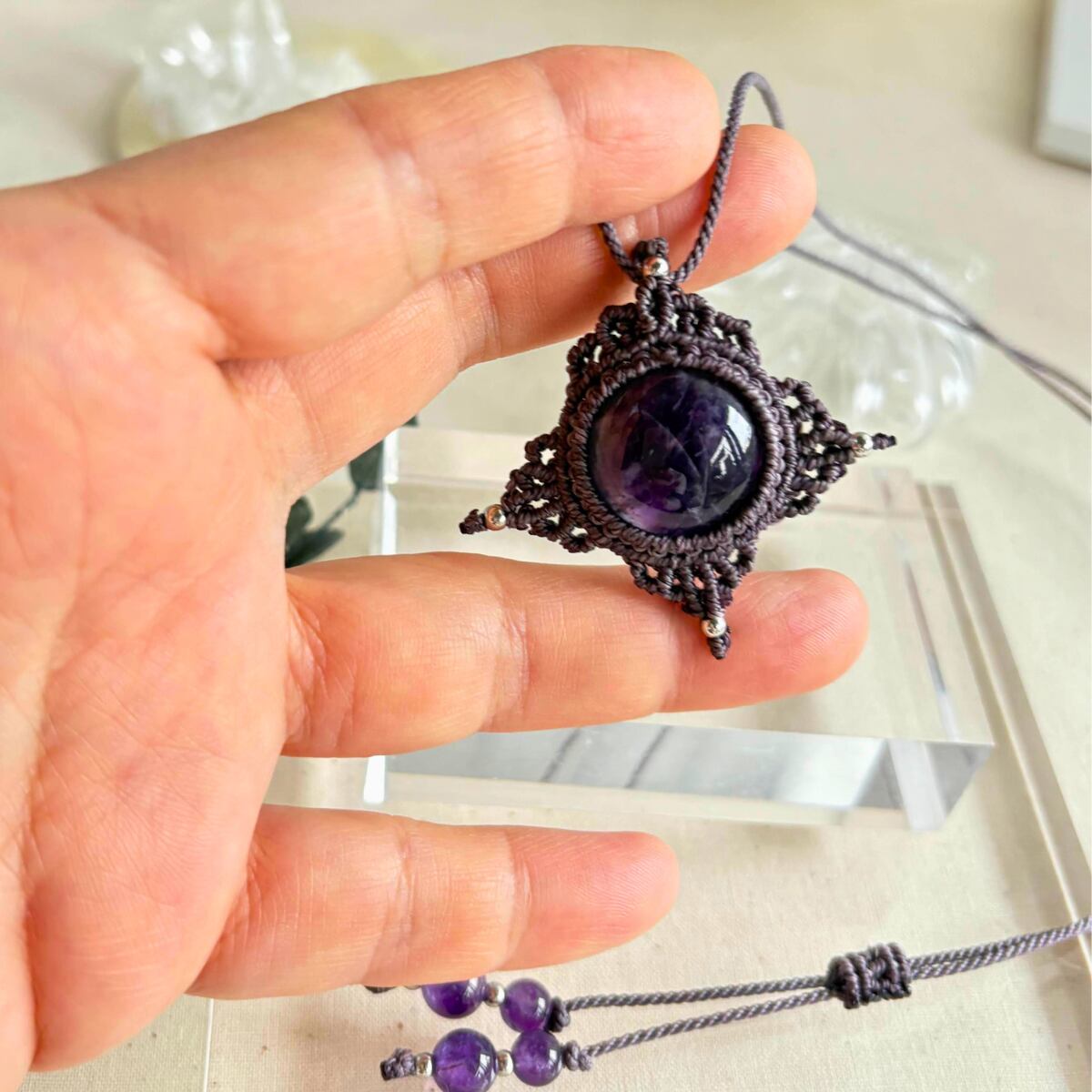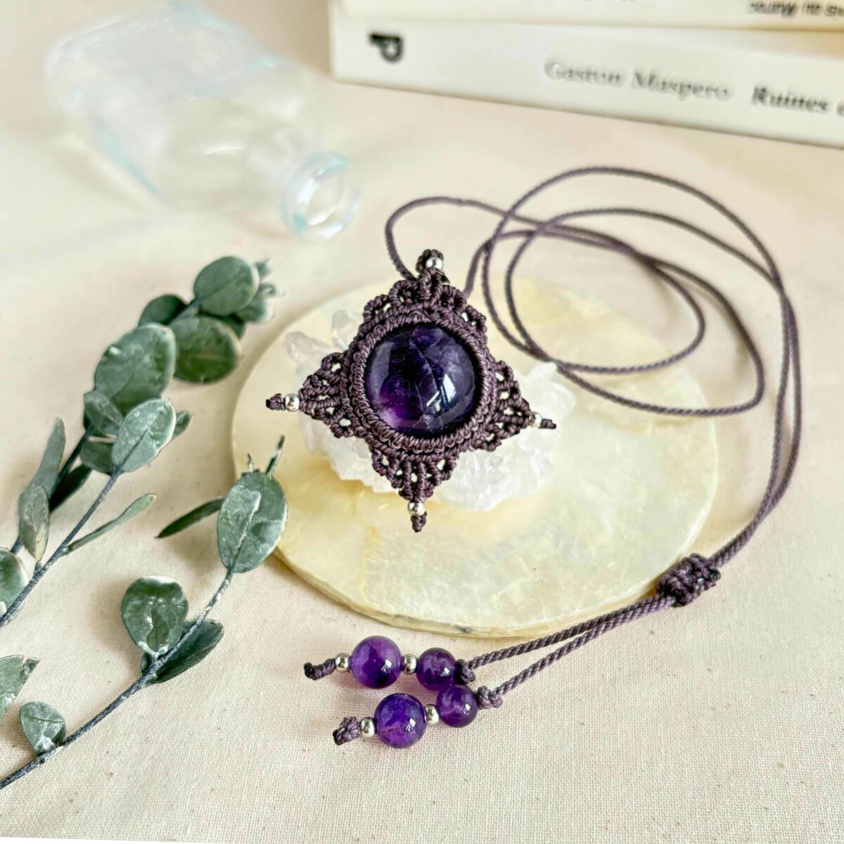 美しい紫色が印象的なアメジストを、同系色の紫紐で丁寧に編み上げた