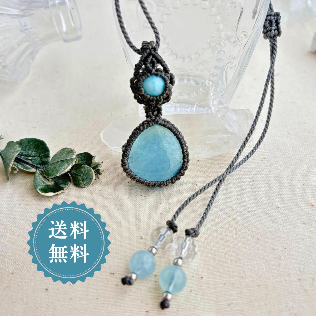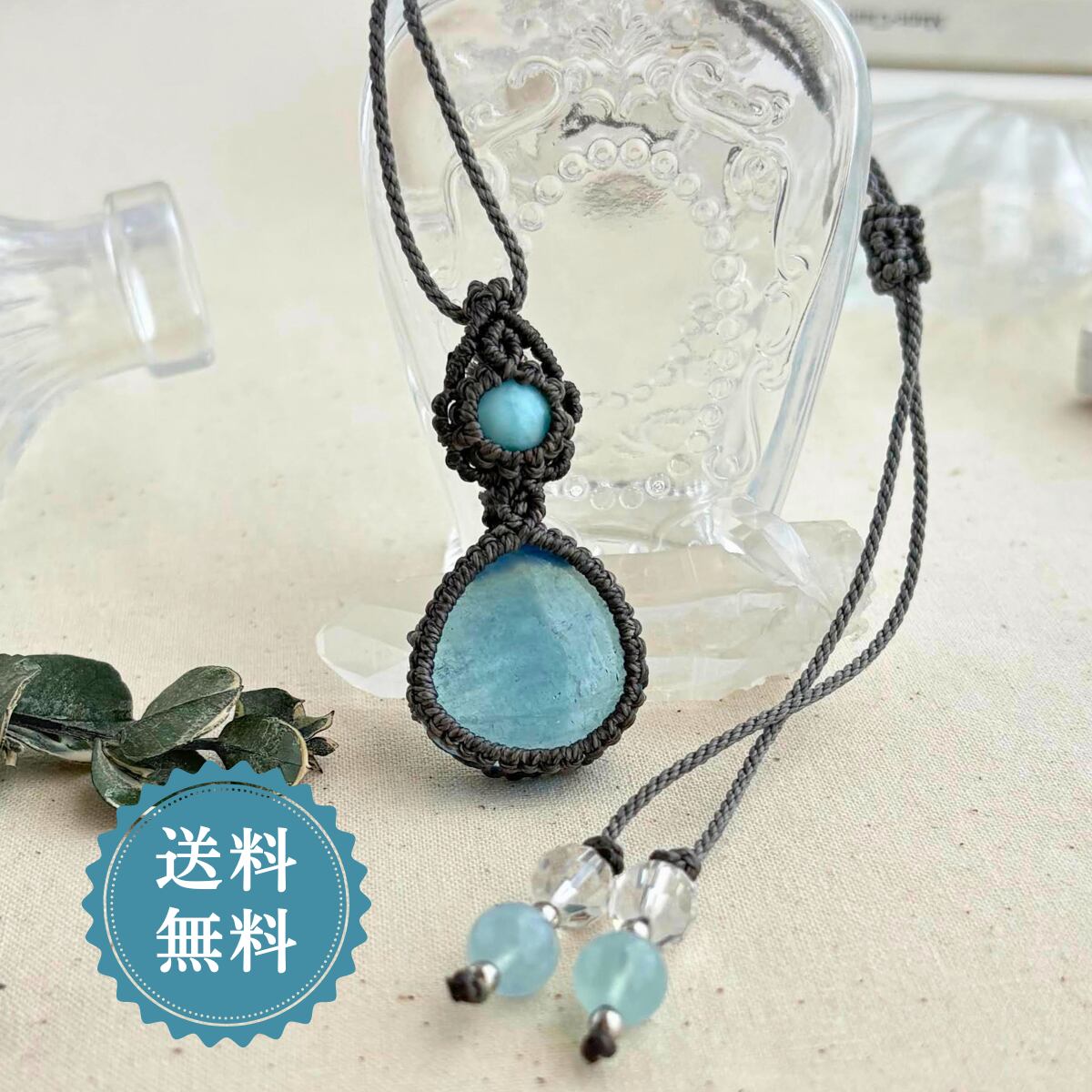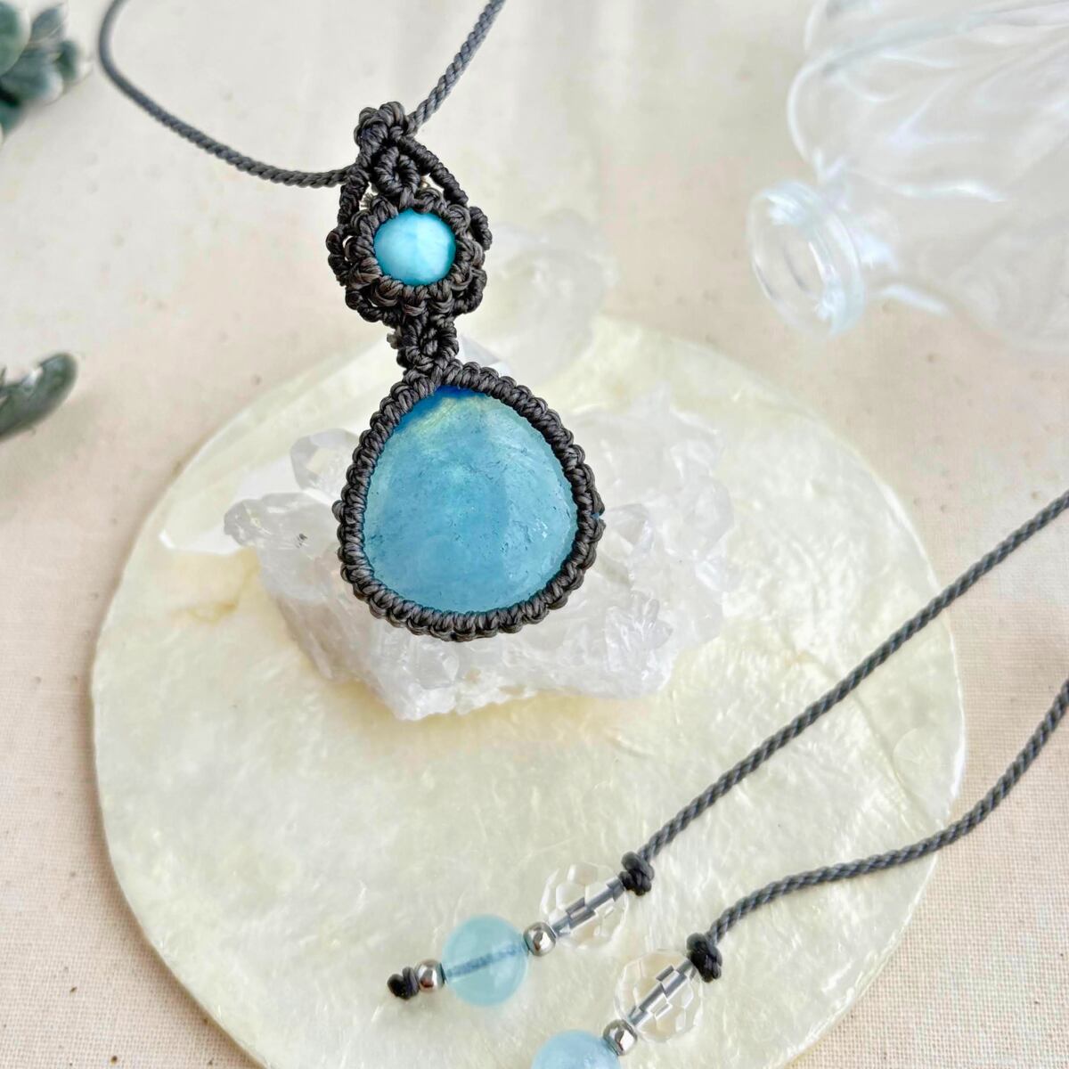 ペンダントトップ ネックレス ペンダント 天然石 ラリマー アクアマリン 金属アレルギー対応 マクラメ編み 大人可愛い プレゼント 大人カッコいい グレー紐 610411