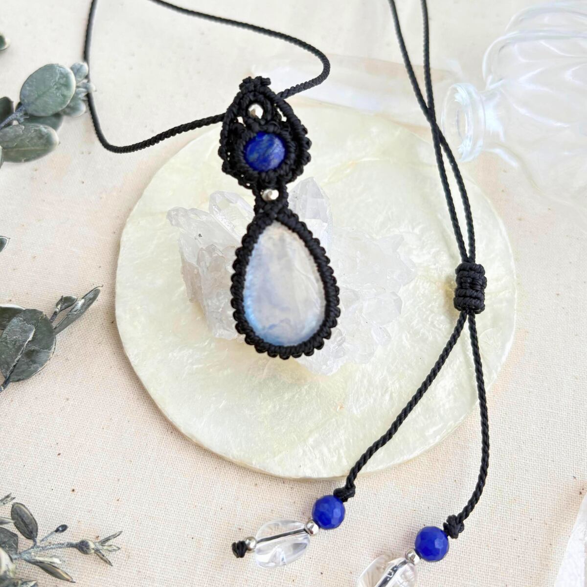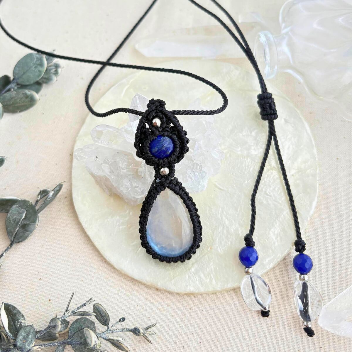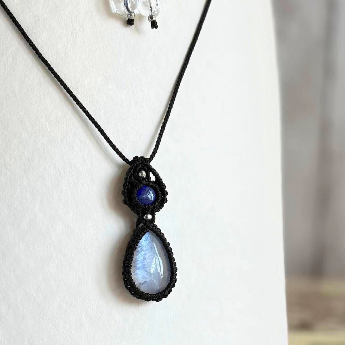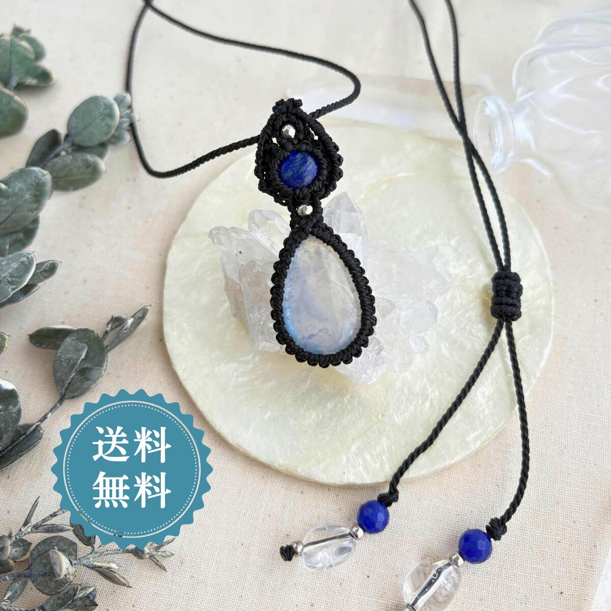 ペンダントトップ ネックレス ペンダント 天然石 ブルームーンストーン 金属アレルギー対応 マクラメ編み 大人可愛い プレゼント 大人カッコいい 黒紐 610415