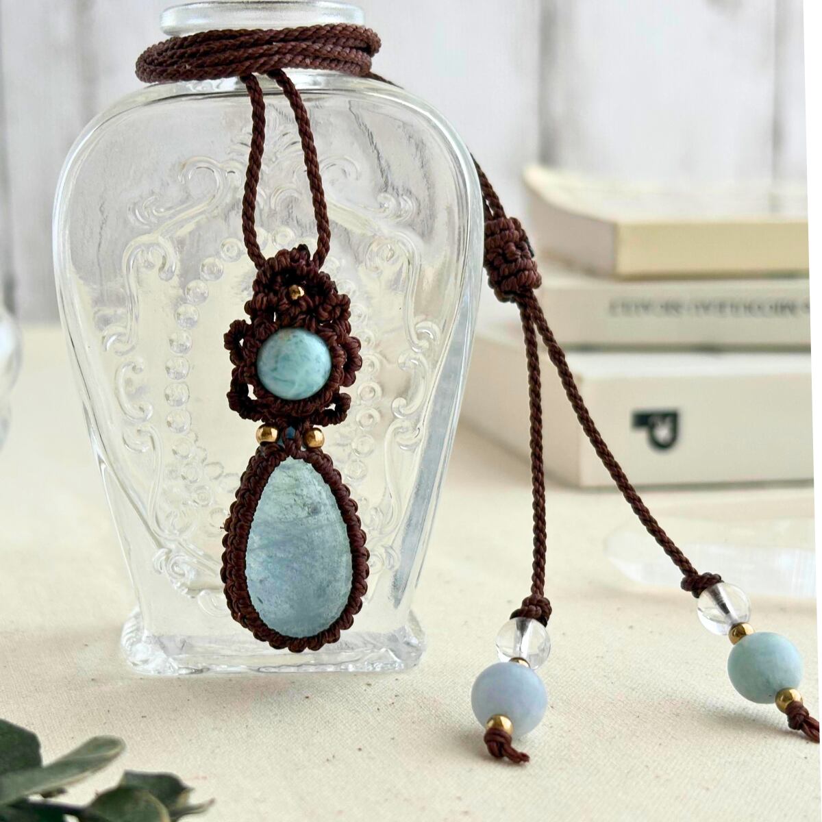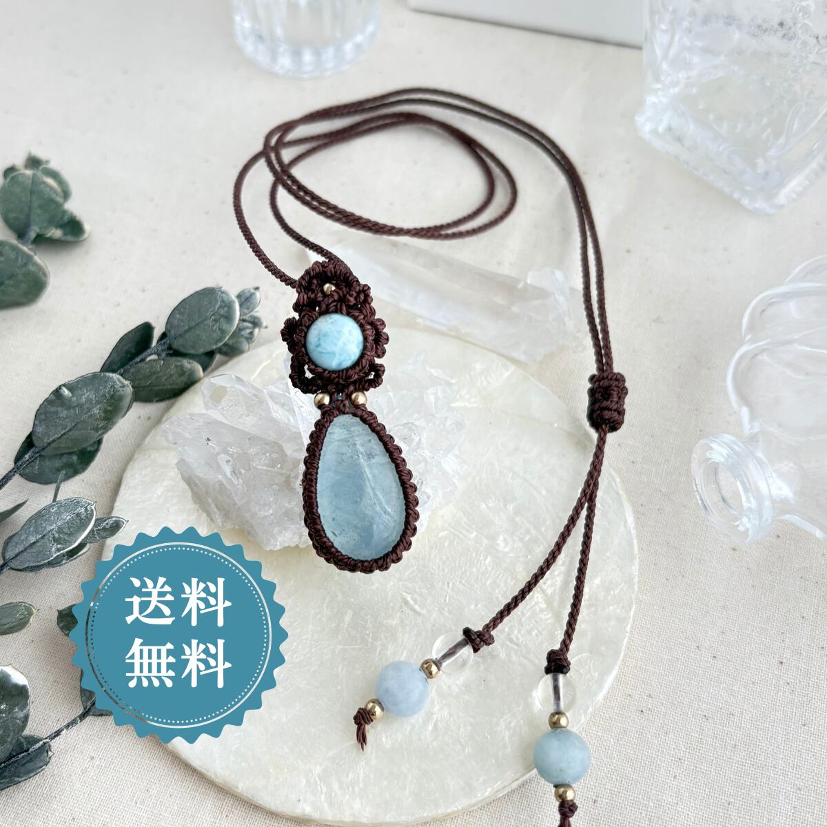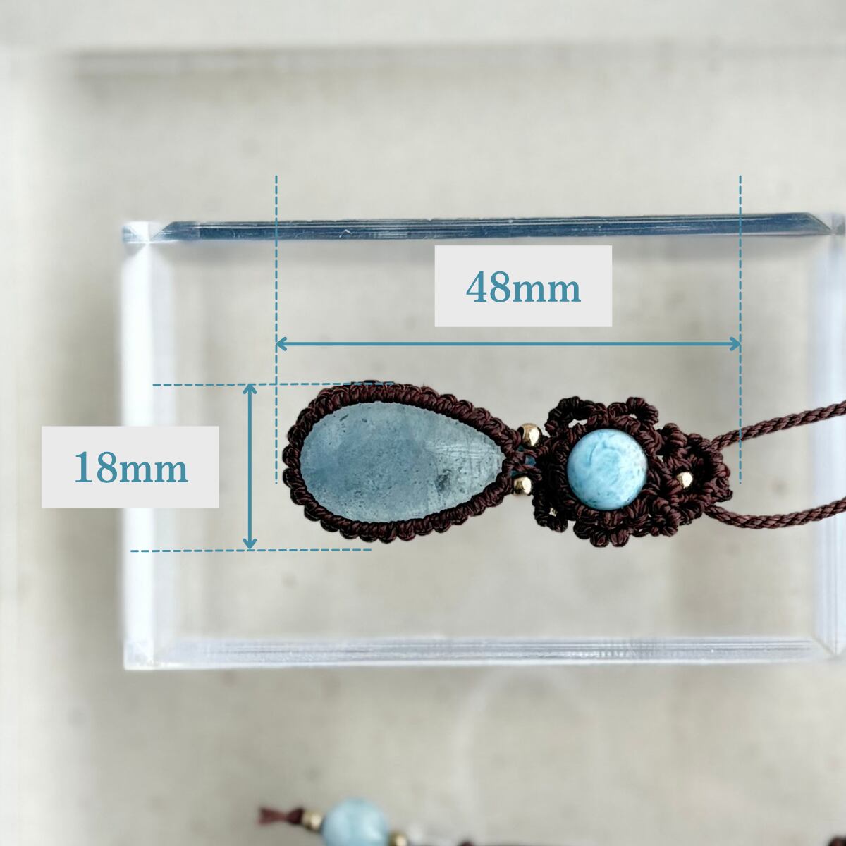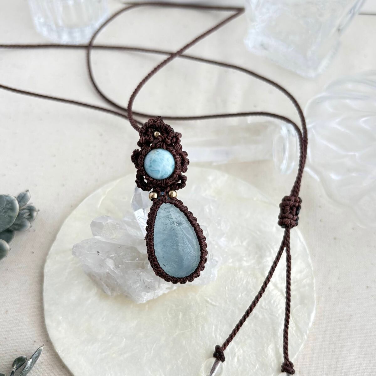 ペンダントトップ ネックレス ペンダント 天然石 ラリマー アクアマリン 金属アレルギー対応 マクラメ編み 大人可愛い プレゼント 大人カッコいい 茶紐 610416