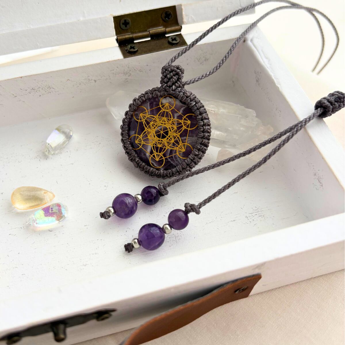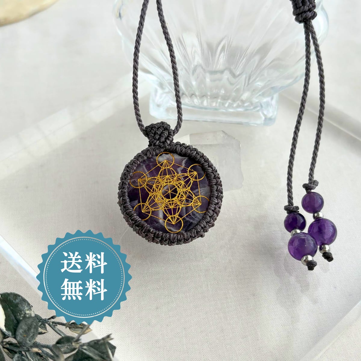 ペンダントトップ ネックレス ペンダント アメジスト 天然石 メタトロンキューブ 神聖幾何学 金属アレルギー対応 マクラメ編み 大人可愛い プレゼント 母の日 グレー紐 610426