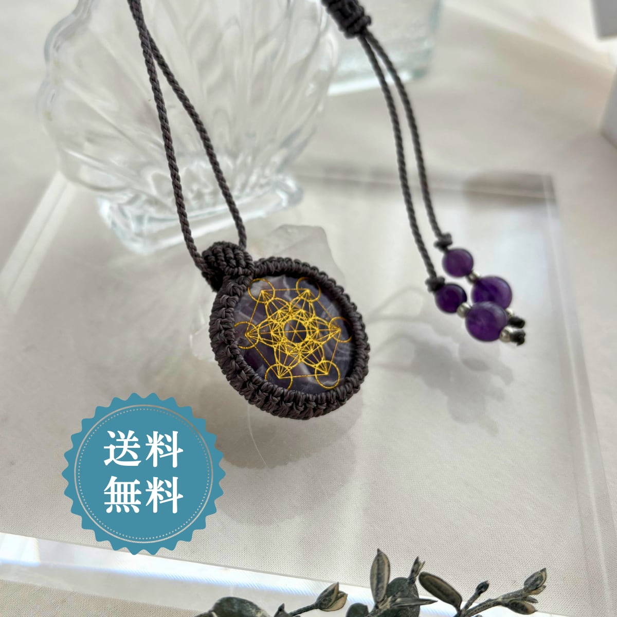 深みのあるアメジストに、繊細なメタトロンキューブ(幾何学模様)をあしらった、