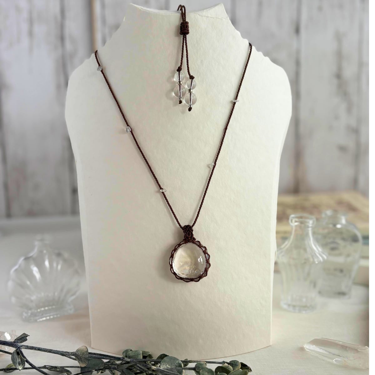 ペンダント ネックレス アイリスクォーツ 水晶 マクラメ編み 茶色紐 金属アレルギー対応 ギフト シンプル 大人可愛い 610436