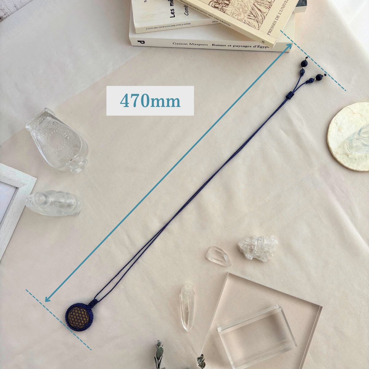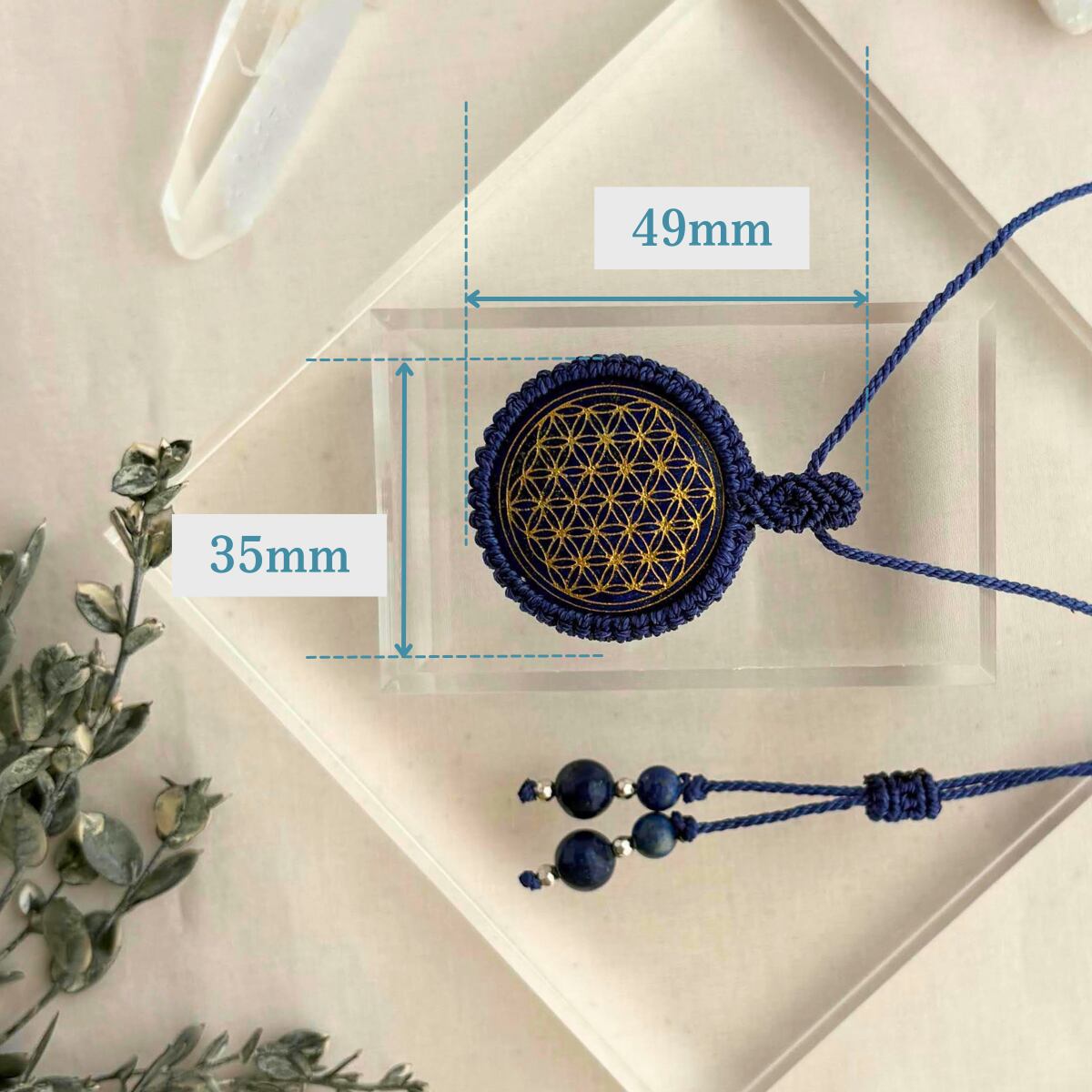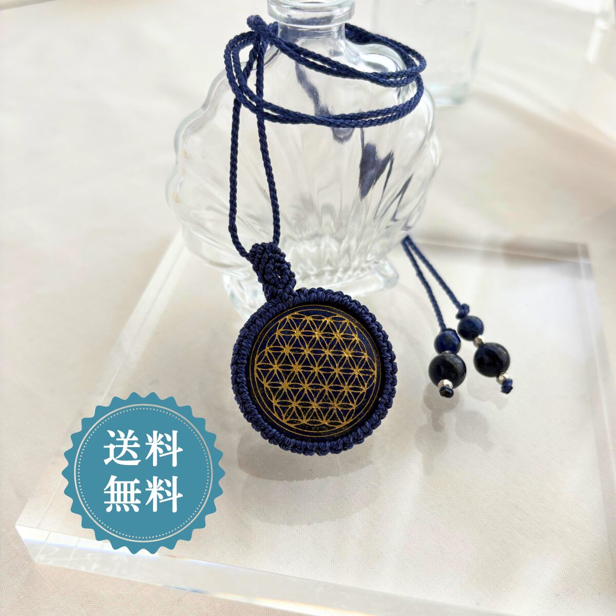深い群青のラピスラズリに、神聖幾何学「フラワーオブライフ」の模様が
