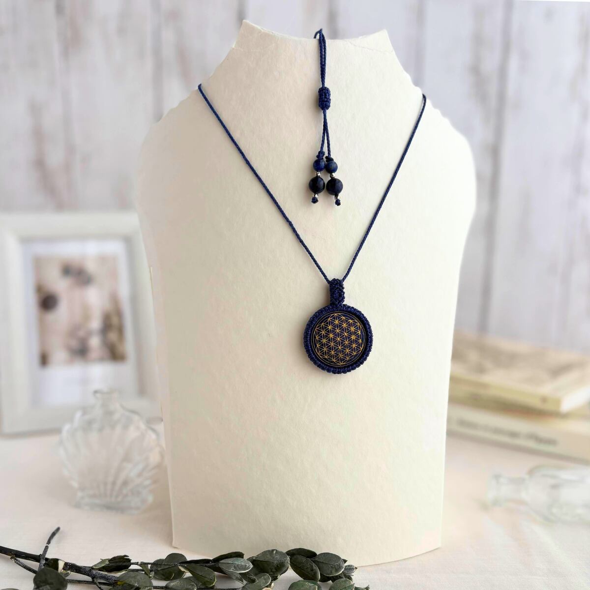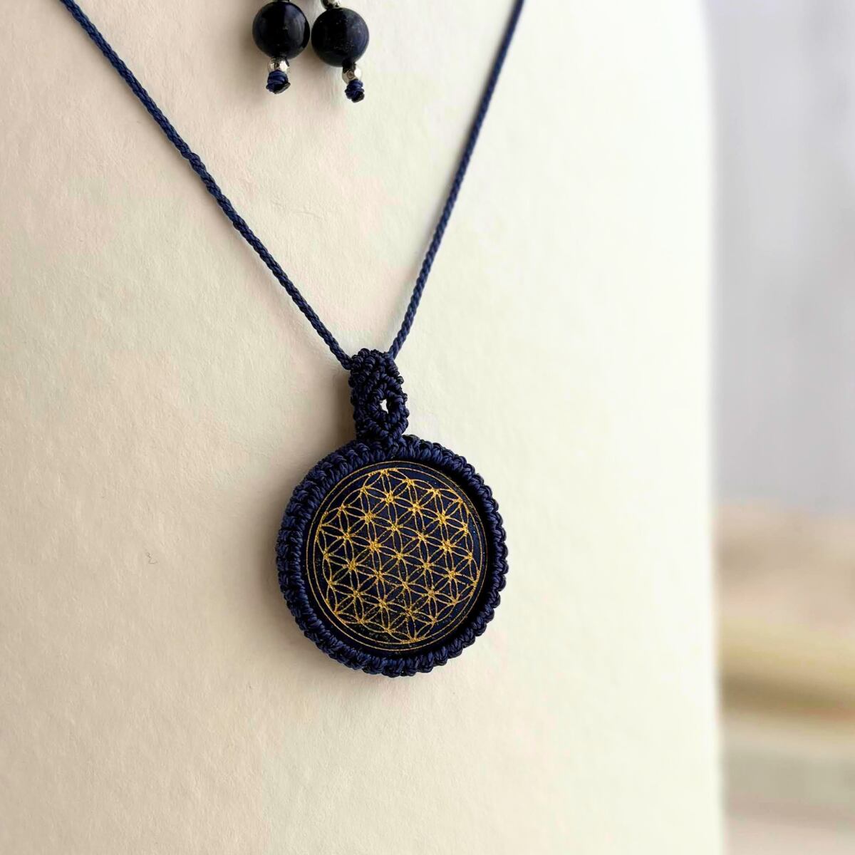 神聖幾何学 天然石 マクラメ編み 紺色紐 金属アレルギー対応 ギフト
