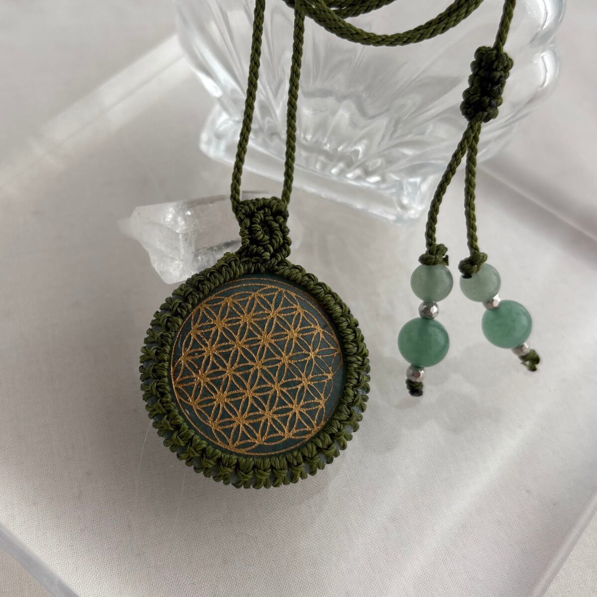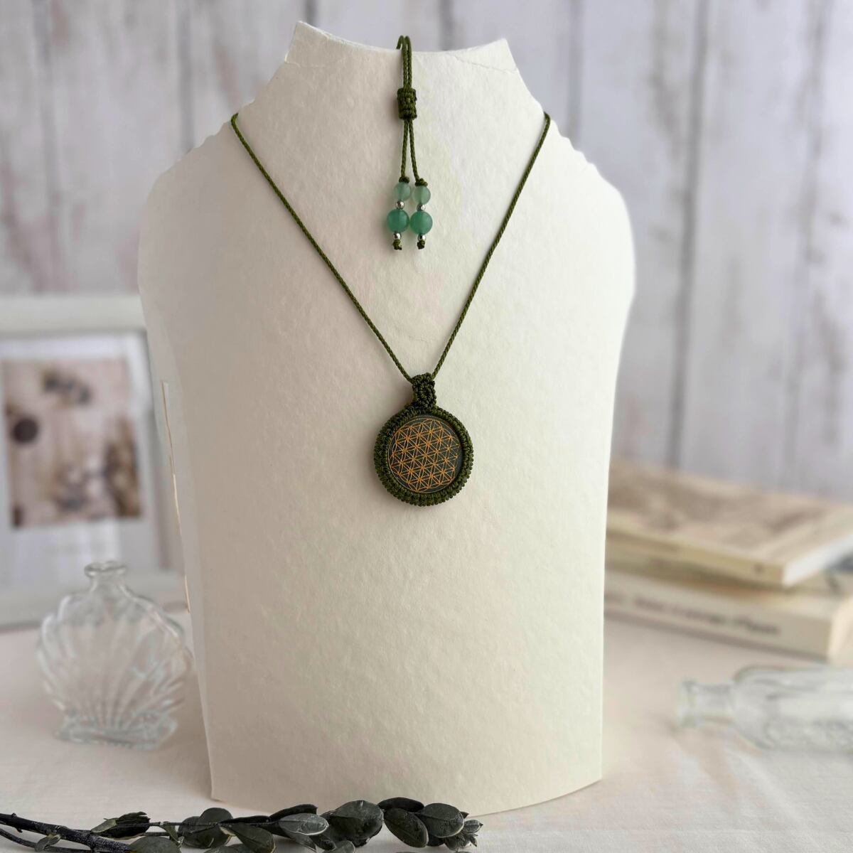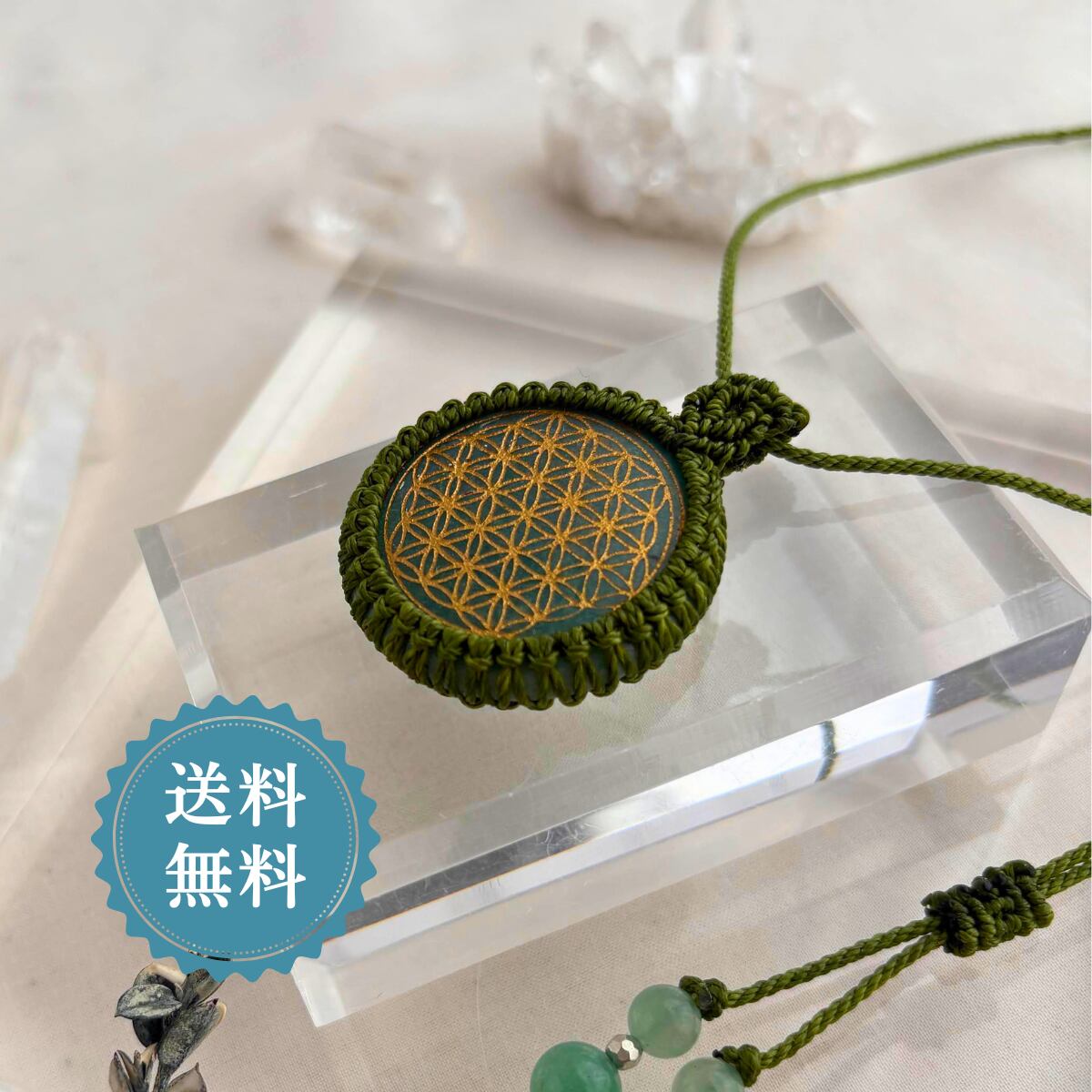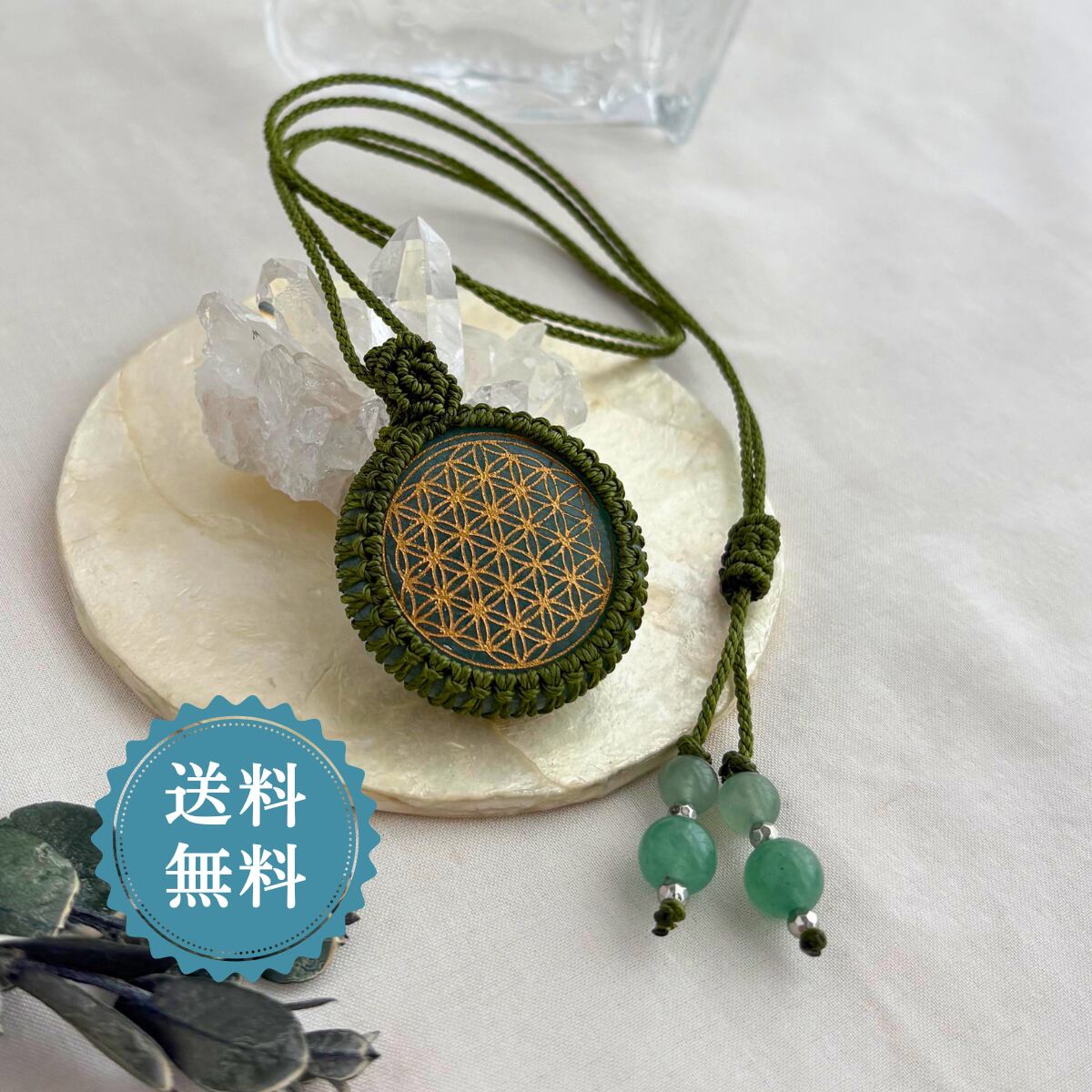 ペンダント ネックレス アベンチュリン フラワーオブライフ 神聖幾何学 天然石 マクラメ編み 緑色紐 金属アレルギー対応 ギフト シンプル 大人可愛い 610429