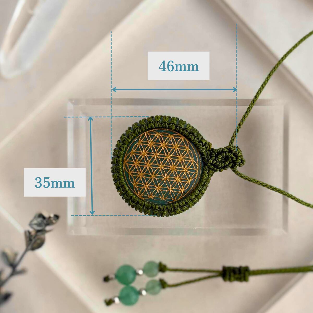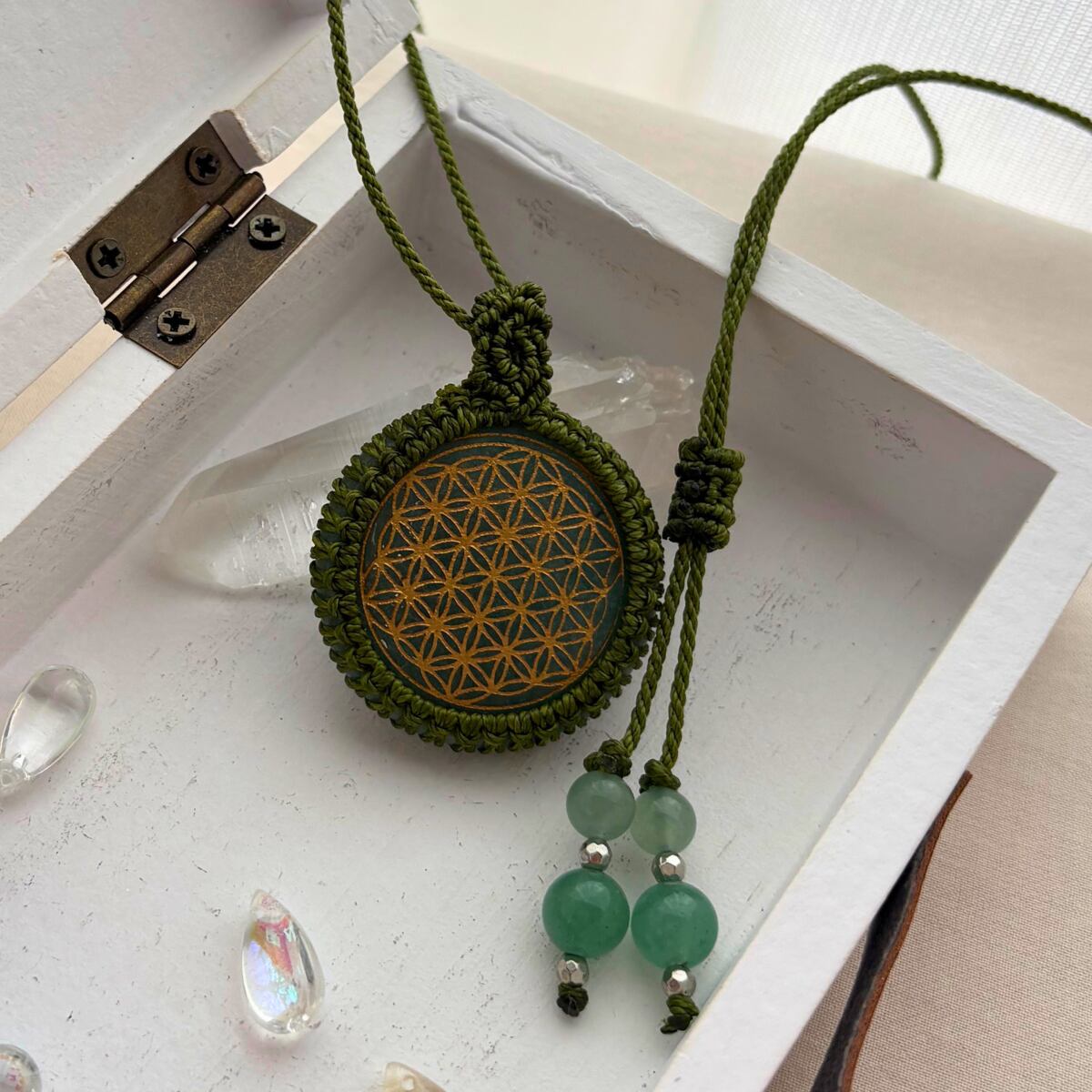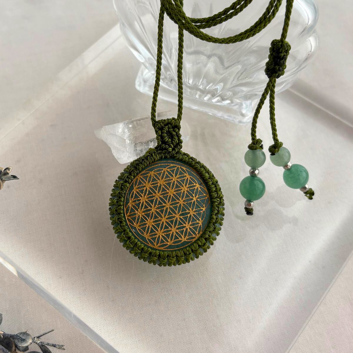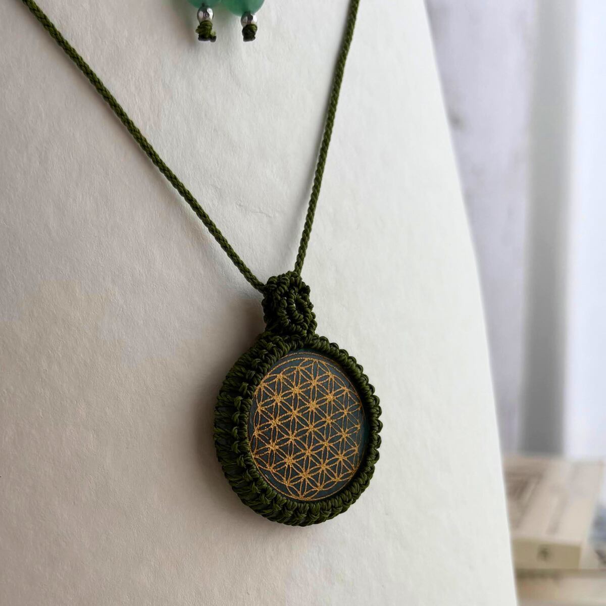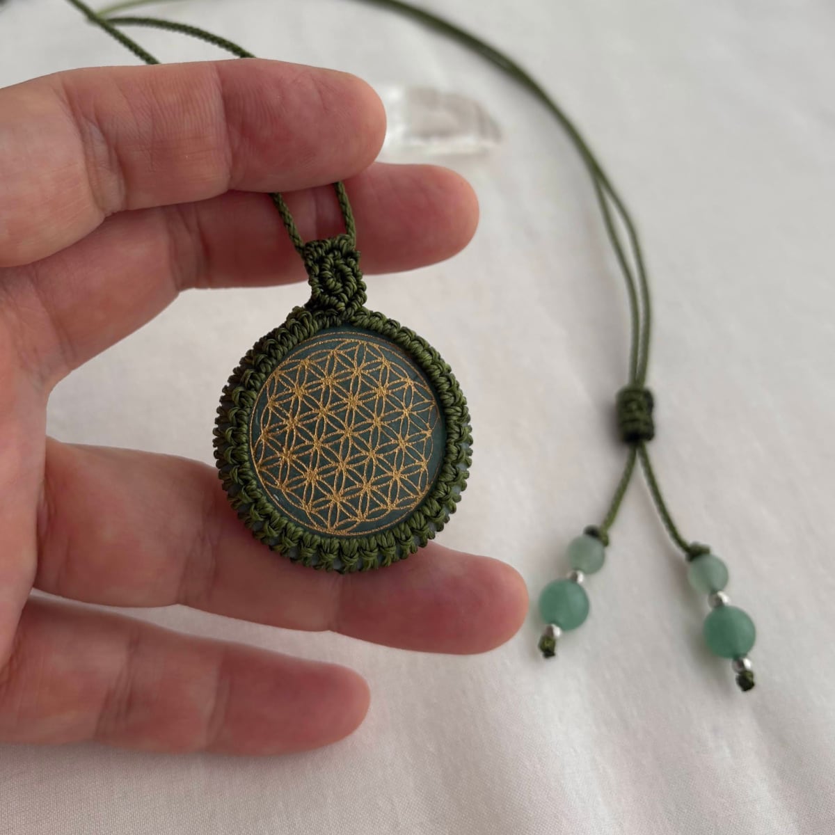 ペンダント ネックレス アベンチュリン フラワーオブライフ 神聖幾何学 天然石 マクラメ編み 緑色紐 金属アレルギー対応 ギフト シンプル 大人可愛い 610429