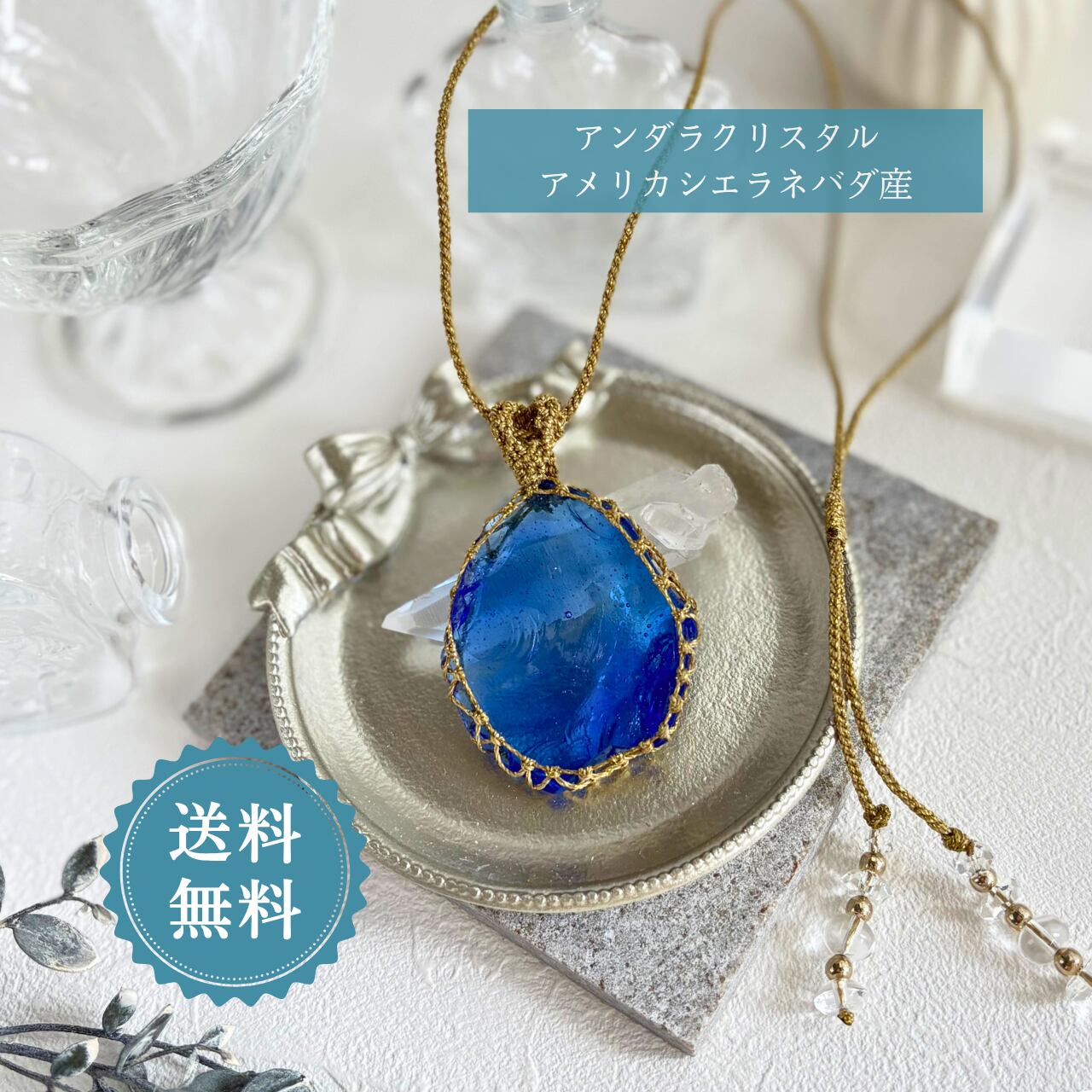 ペンダントトップ 天然石 大きめ 金属アレルギー対応 大人かわいい アンダラクリスタル マクラメ 青色 エレスチャルサファイア