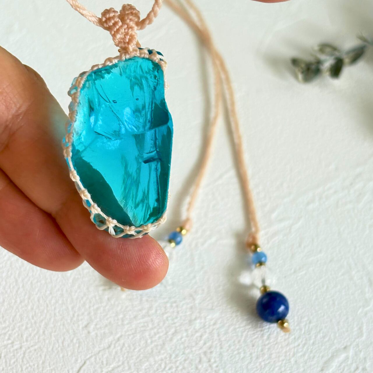ペンダントトップ 天然石 大きめ 金属アレルギー対応 大人かわいい アンダラクリスタル マクラメ 水色 エレクトリックブルー 30612