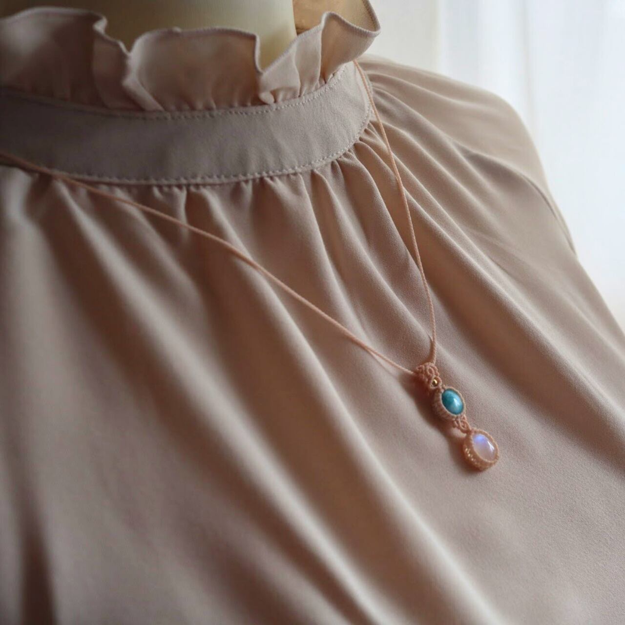 マクラメ編みによって上品な表情を持つ一点物の天然石ペンダントは、