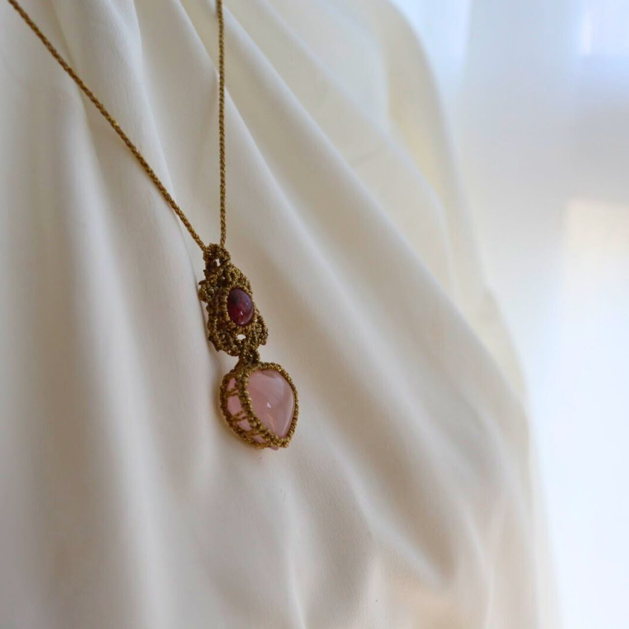 天然石の美しさを引き立てる、マクラメで編まれたペンダントトップ。