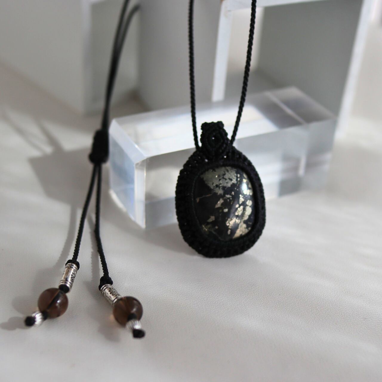 ヒーラーズゴールドを用いたマクラメで織り上げられた、大人のためのアクセサリー。