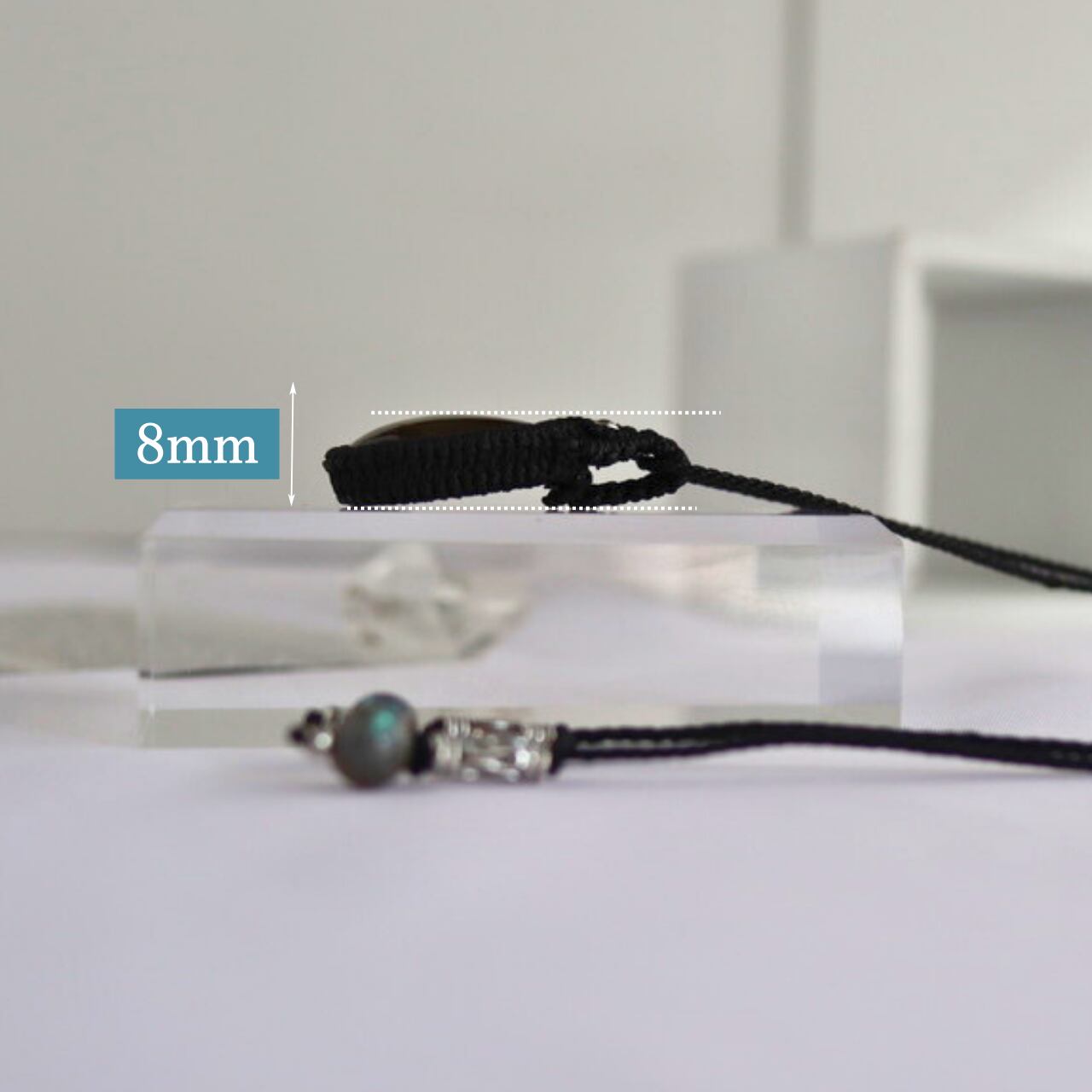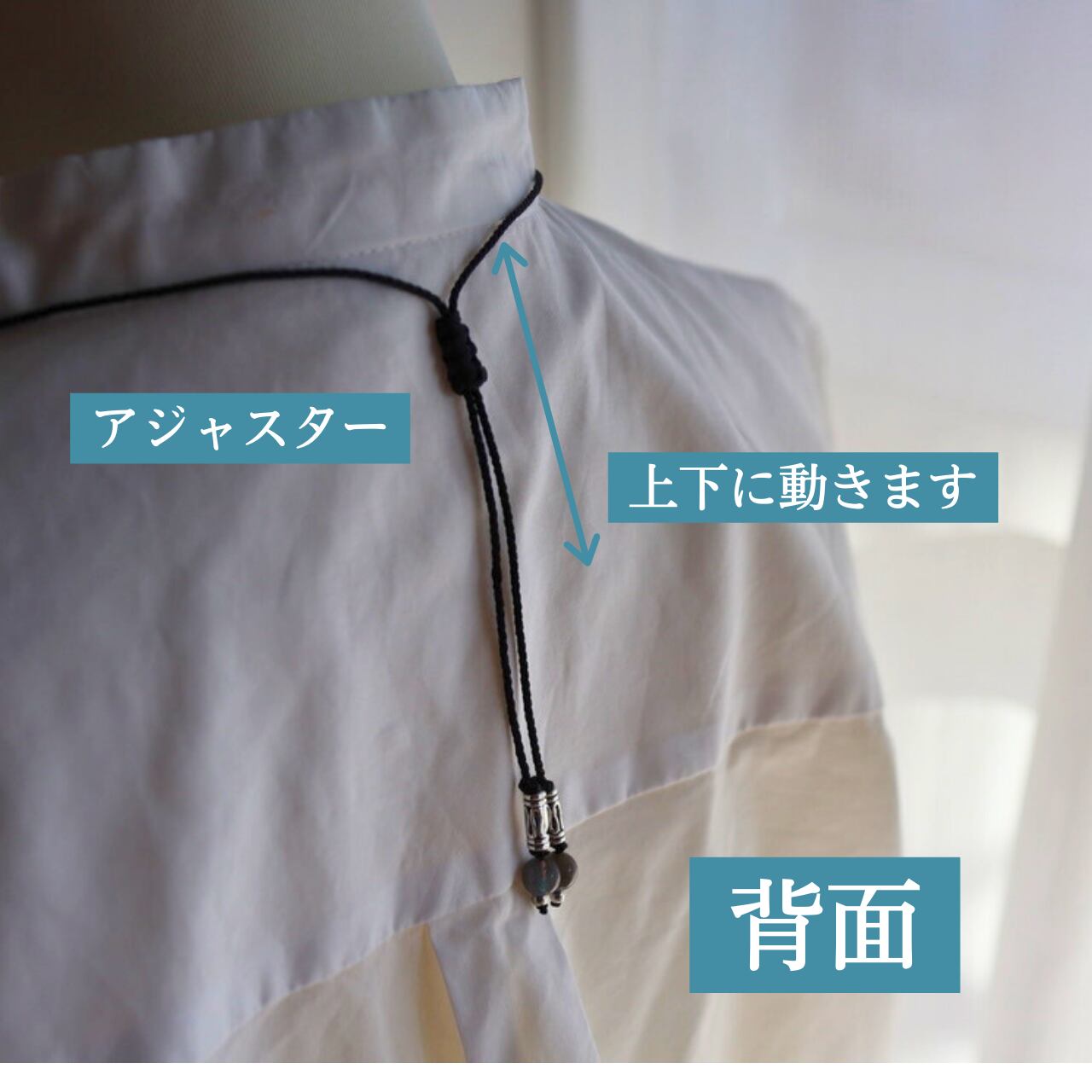 石の形に合わせてマクラメ技法で手作りされた黒紐で仕上げられています。