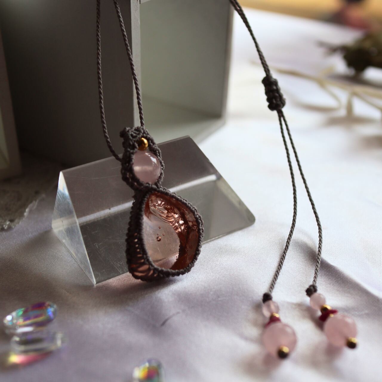 ペンダントトップ ネックレス 天然石 金属アレルギー対応 マクラメ アンダラクリスタル デザートローズ ローズクォーツ 404008 大人かわいい 天然石 ピンク ヒーリング レムリア グレイ紐