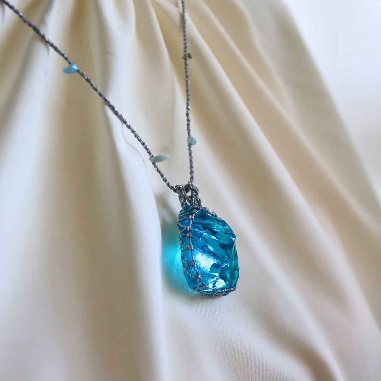 紐部分にアクアマリンのさざれ石を編み込みました。