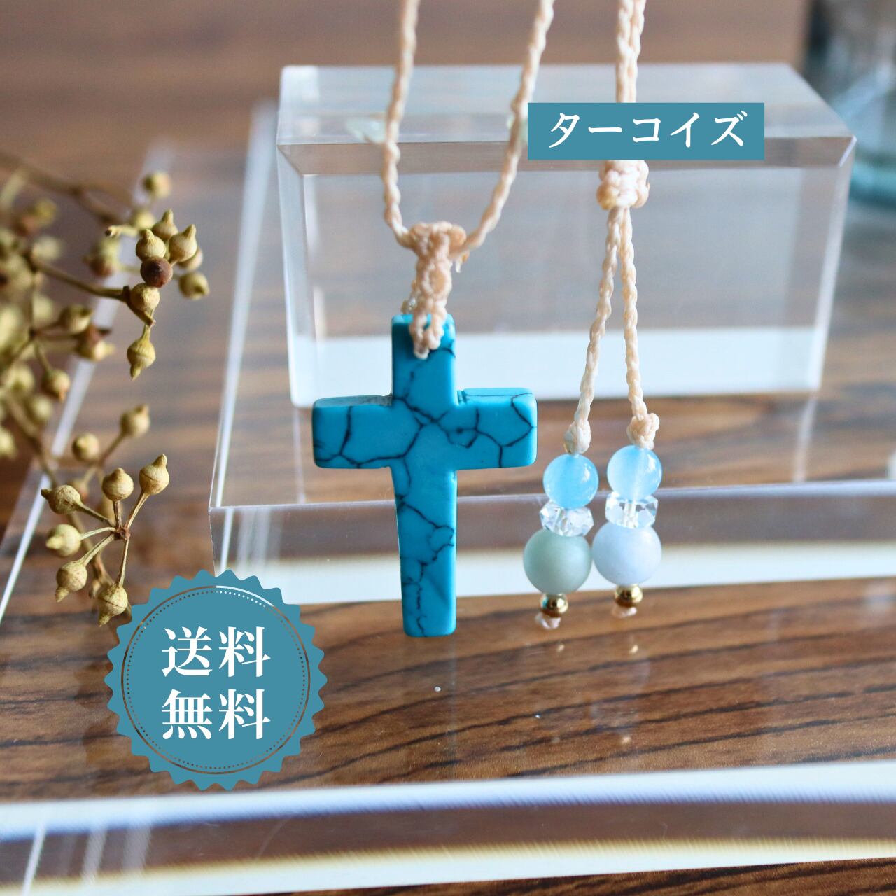 ペンダントトップ 十字架 クロス ターコイズ 12月誕生石 ネックレス 天然石 金属アレルギー対応 マクラメ編み 水色 大人かわいい プレゼント 白紐 410805